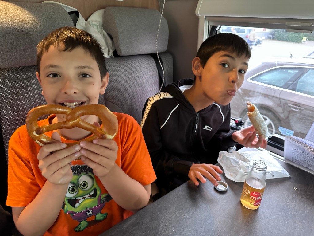 Verso le 13 approfittiamo di un momento senza pioggia per fermarci a pranzare e sgranchirci le gambe in una delle innumerevole aree sosta lungo l’autostrada. Chiara prepara i bonbon, ovvero degli involtini di lonza ripieni con una cremina al formaggio e coperti di paprika, per contorno una bella valeriana. Il camper si riempie di un odore super tedesco, ma invitante. Ad accompagnare e per “sgrassare” una Radler, comprata durante il passaggio in Austria di ieri, come ricordo dell’estate scorsa.