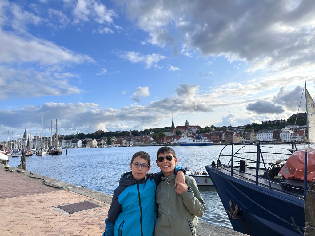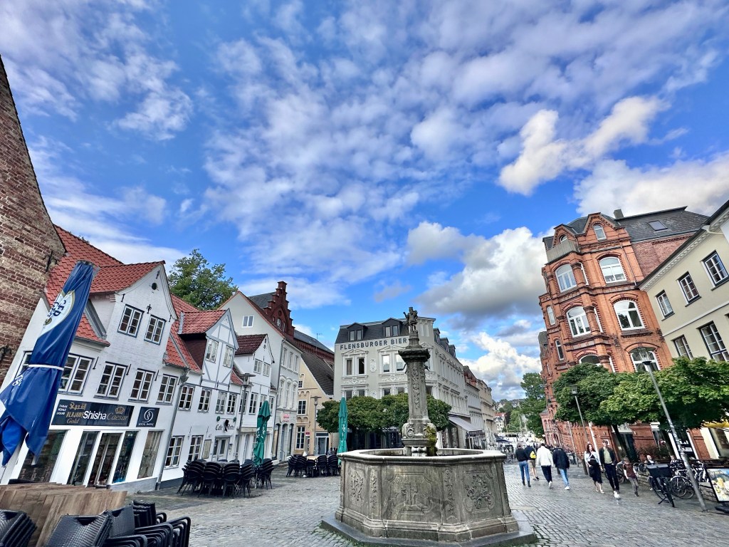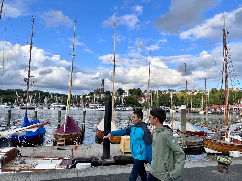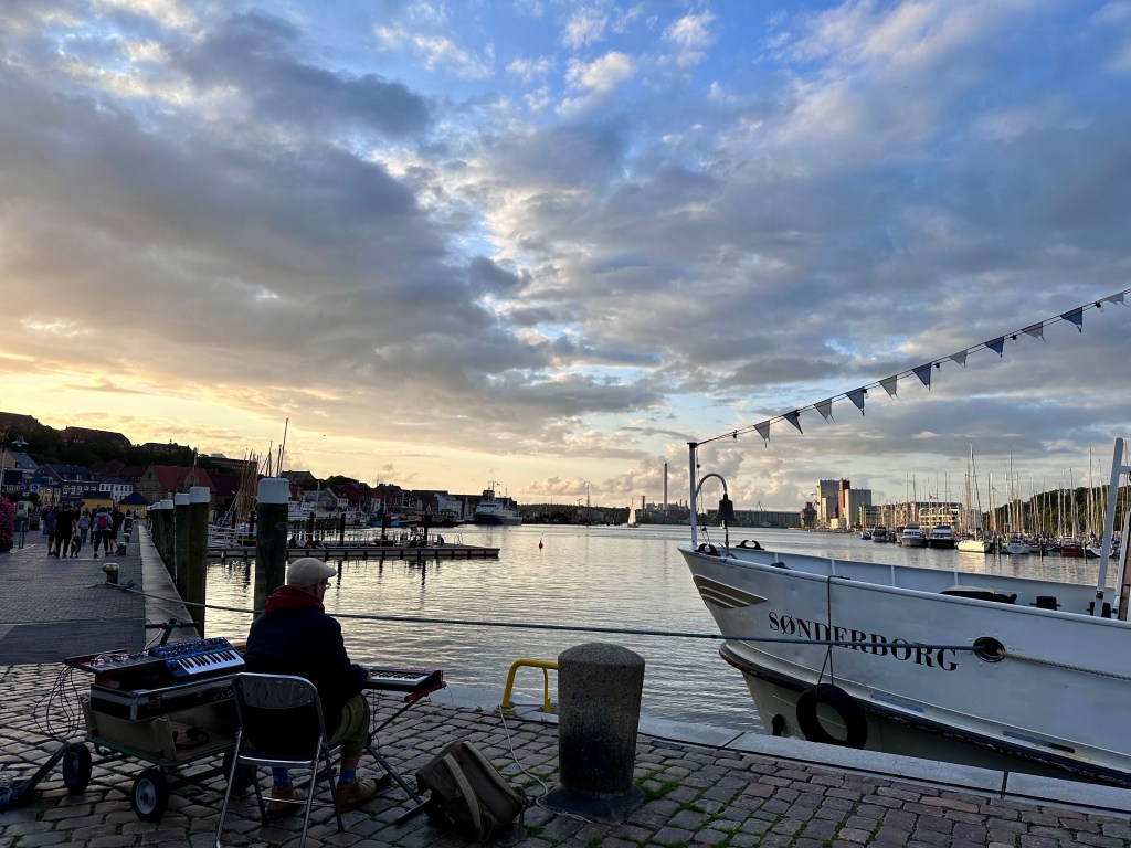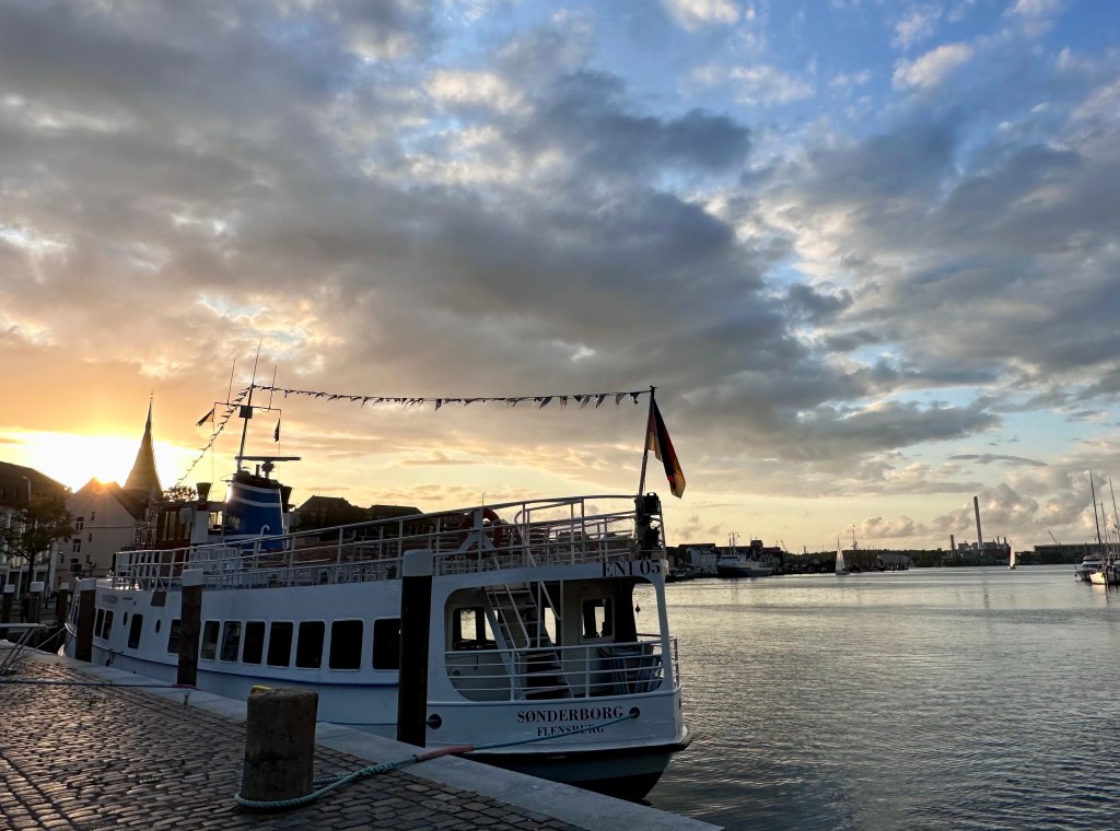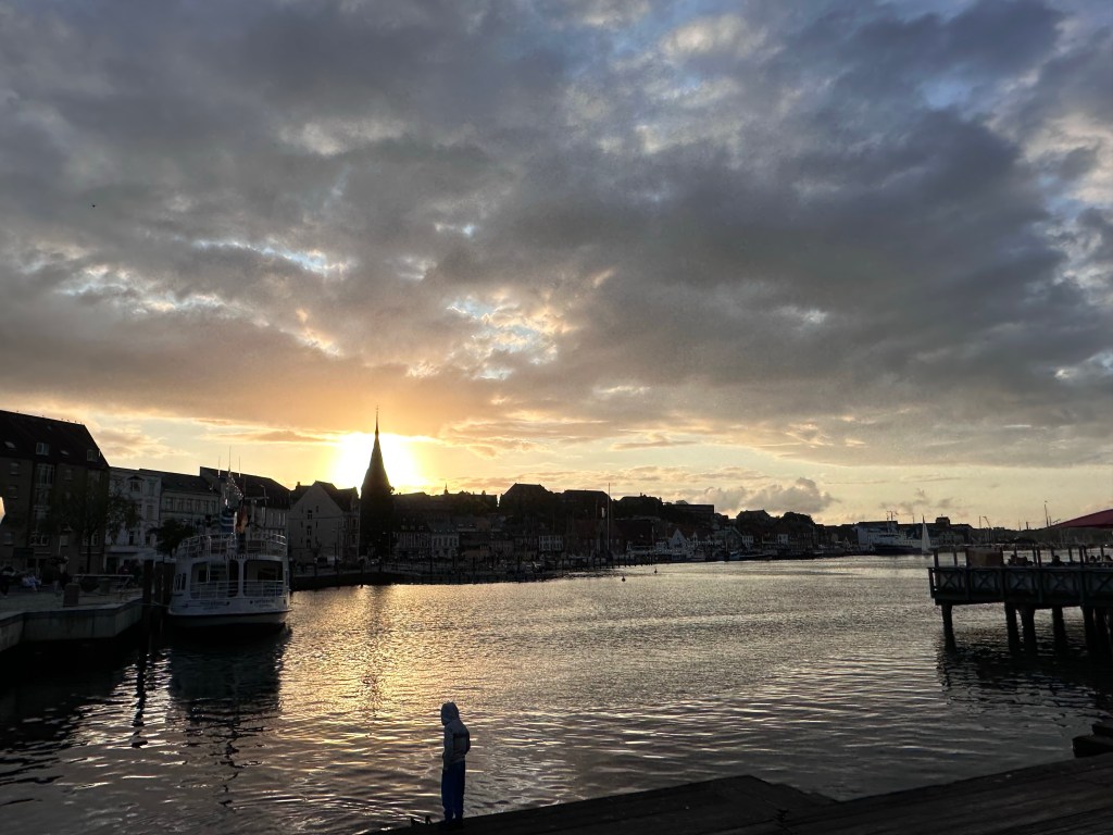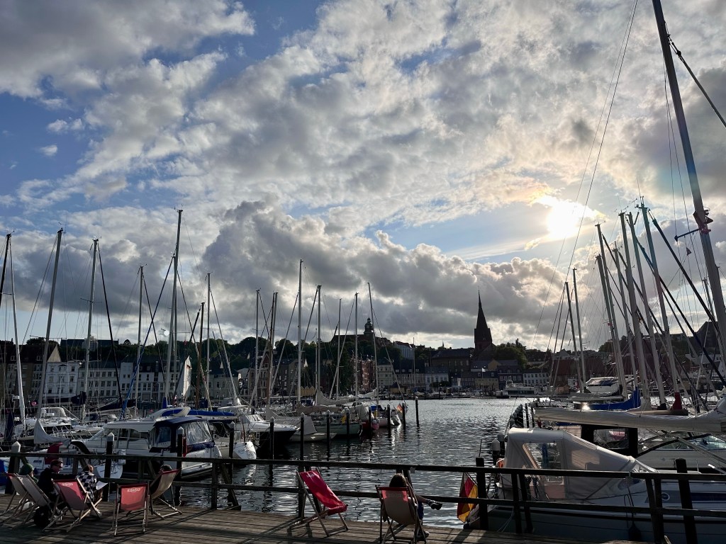 Ormai si sono fatte le 19 e decidiamo di fermarci a Flensburg, ultima città significativa al di qua della frontiera. Dalle foto ci sembra carina e soprattutto ha un bel porto sul Mar Baltico. Così troviamo un parcheggio proprio sul canale di mare che divide il centro città e facciamo una piacevole passeggiata durante la cosiddetta magic hour. La luce infatti è stupenda, le nuvole di accendono di colori fantastici, valorizzando ancora di più le barche a vela ormeggiate, gli aguzzi edifici dell’architettura nordica e i tavolini con la gente seduta di fronte ai moli del porto a fare l’aperitivo. Il cielo è già quello del Nord, che ricordavo dai viaggi fatti con il camper, da ragazzo insieme ai miei. Limpidissimo e con una tavolozza di colori diversa, sempre ricco di nuvole dalle forme incredibili.