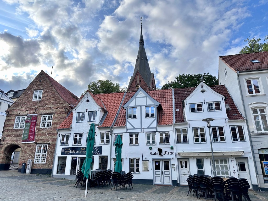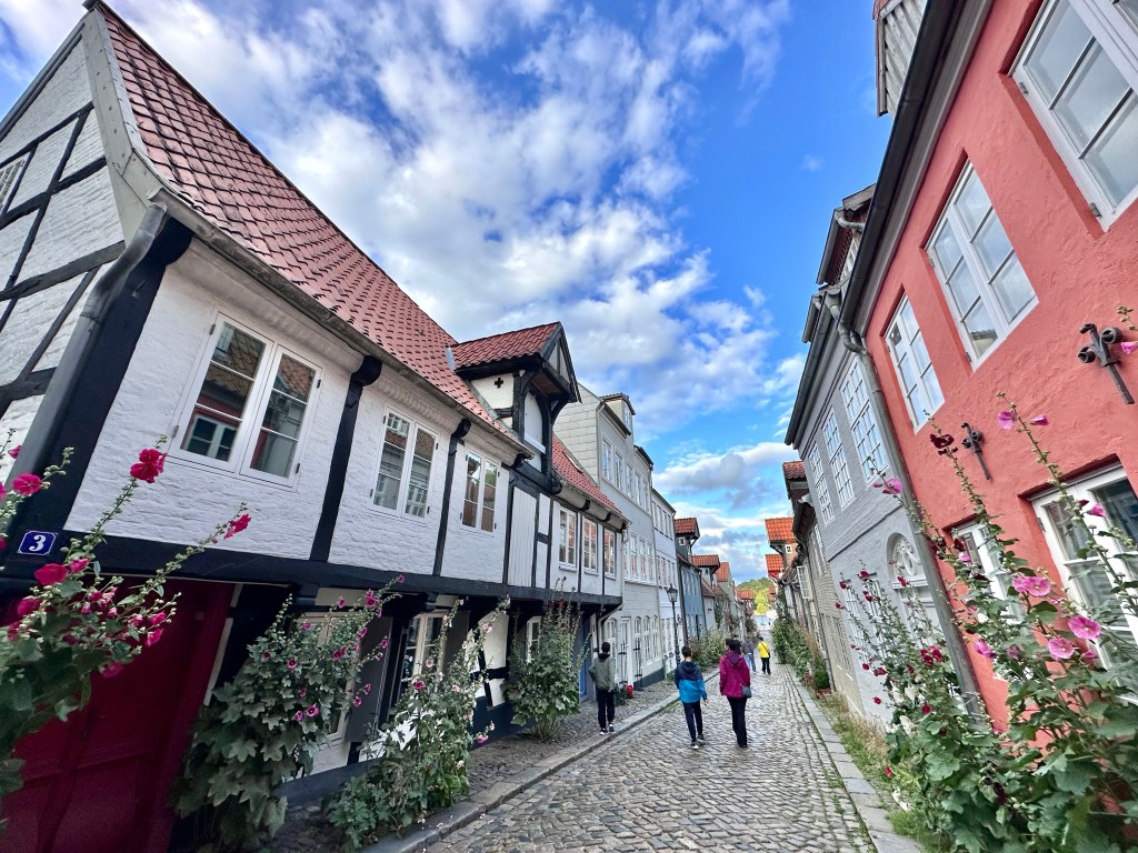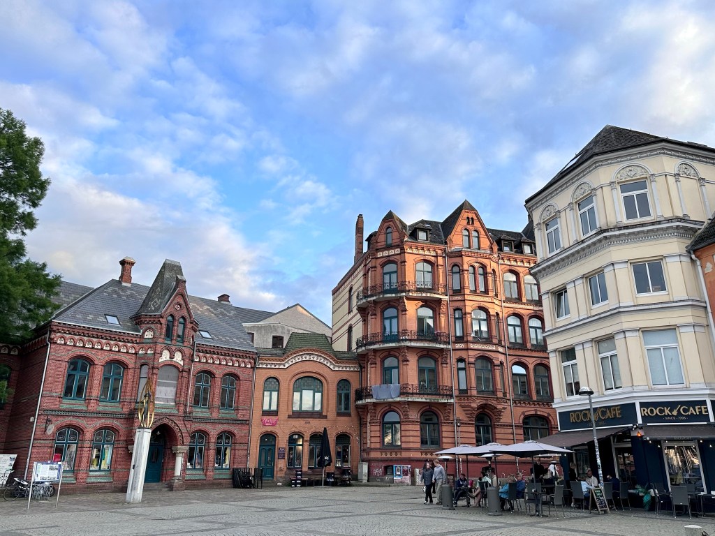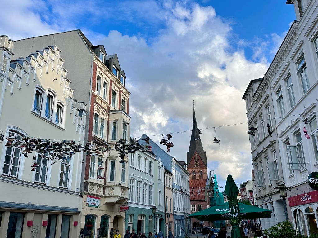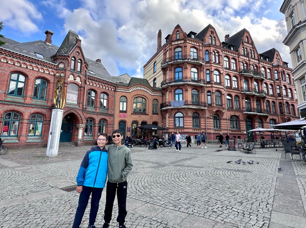 Facciamo quindi un giretto nel centro storico ricco di ristorantini e take away etnici. Gyros Pitta greco, burrito messicani, sushi, indiano, vietnamita, cinese, pub inglese, oltre le immancabili pizzerie e gelaterie dai nomi italiani. Questi sono solo alcuni che vediamo durante la passeggiata fra le casette di mattoncini dal look danese, quelle a graticcio tipiche tedesche ed altre più liberty che ricordano quasi quelle di San Francisco.