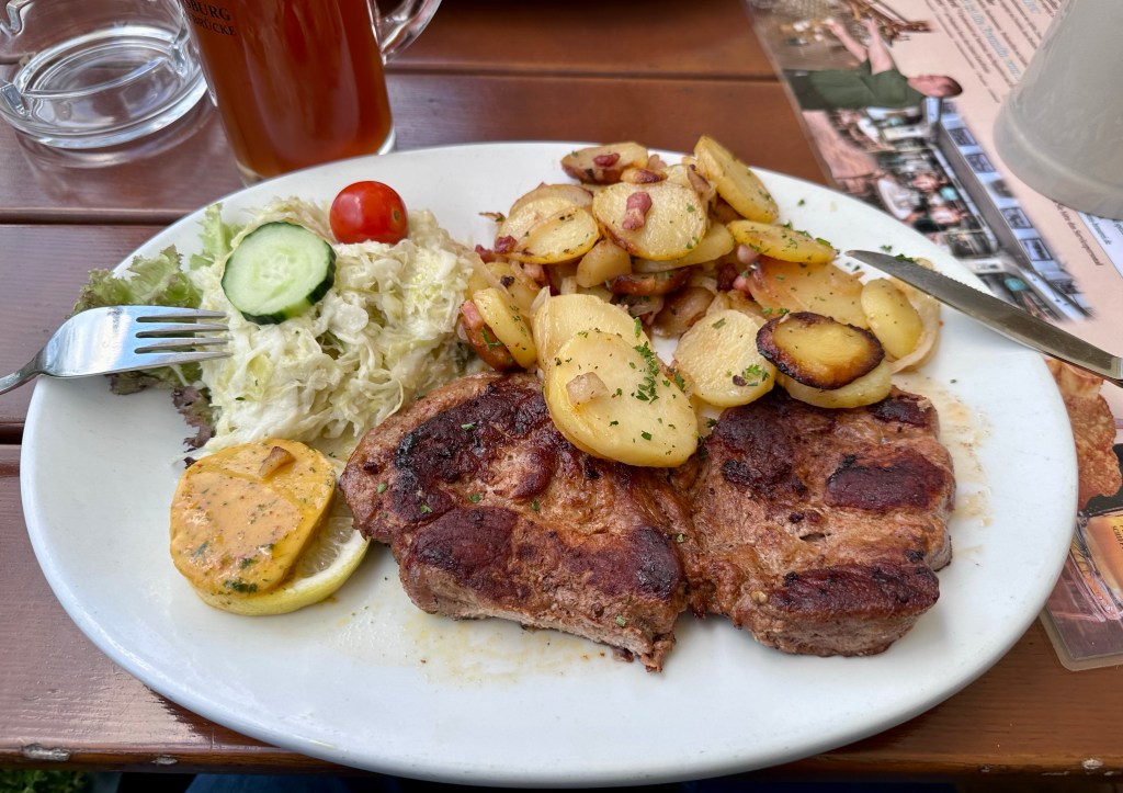 Alla fine decidiamo di fermarci a mangiare alla classica Braurei locale e assaporare quei bei piattoni di carne di maiale cucinati alla tedesca. La scelta è decisamente soddisfacente!