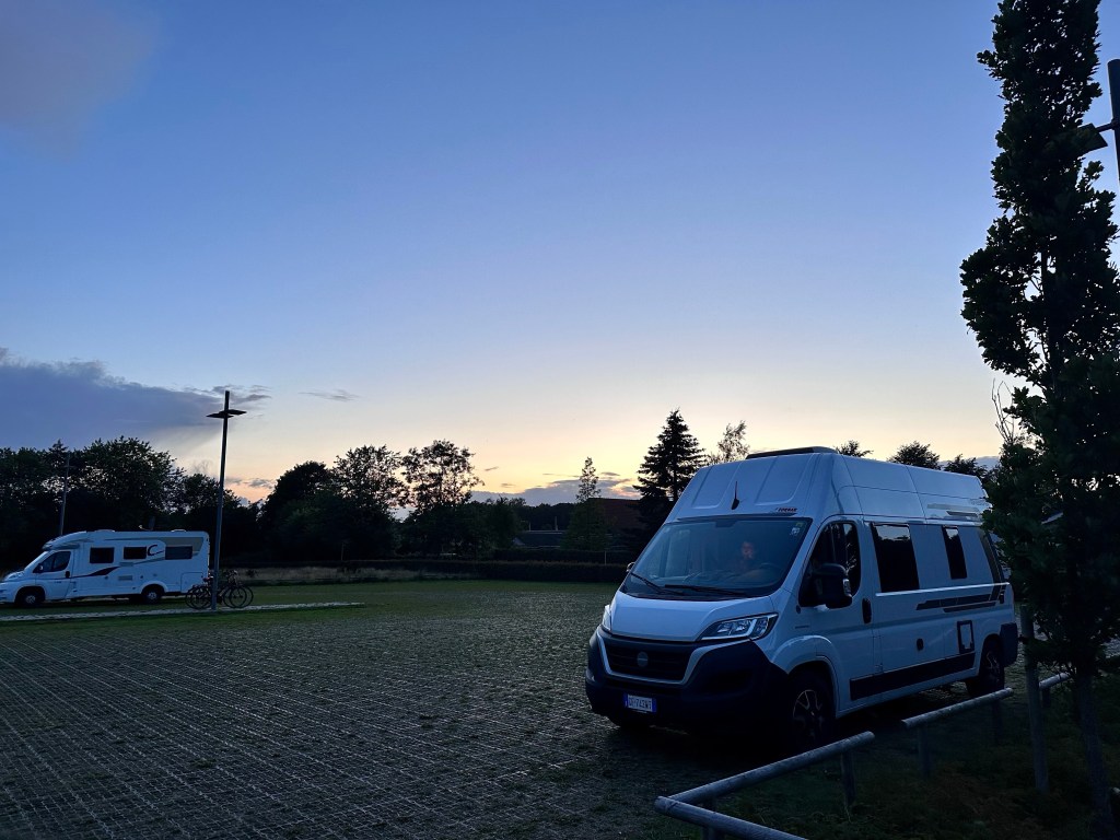 Dopo cena ci rimettiamo in marcia per altri 50 minuti, vogliamo varcare la frontiera ed avvicinarci ancora un po’ alla Lego House, dove abbiamo appuntamento l’indomani alle ore 10. Così ci fermiamo ormai alle 22, alle ultime luci del crepuscolo in un grandissimo e bellissimo spiazzo erboso nella piccola cittadina di Christianfeld