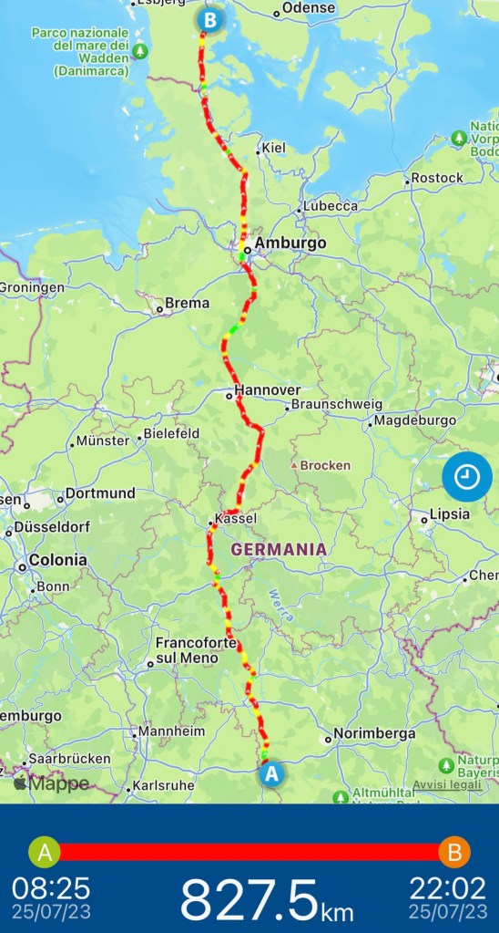 Facciamo rifornimento e si parte, alla volta di Billund, in Danimarca, la città sede della Lego. Il navigatore ci indica 9h di viaggio e sappiamo che dovremo passare il tratto tra Hannover ed Hamburg, notoriamente molto trafficato causa cantieri. Quindi ruote in spalla e si va, sempre fissi sui 100/110 quando non ci sono lavori o scrosci di acquazzoni. Il traffico è scorrevole e i tedeschi, specie i camionisti sono molto disciplinati, perciò la guida non risulta stressante o stancante. C’è un notevole numero di cantieri per rendere questa autostrada a 3 corsie e pensiamo che sia una bella notizia per quando torneremo al Nord in futuri viaggi.