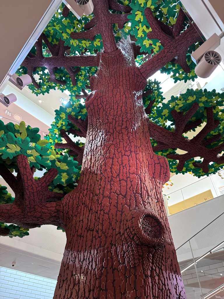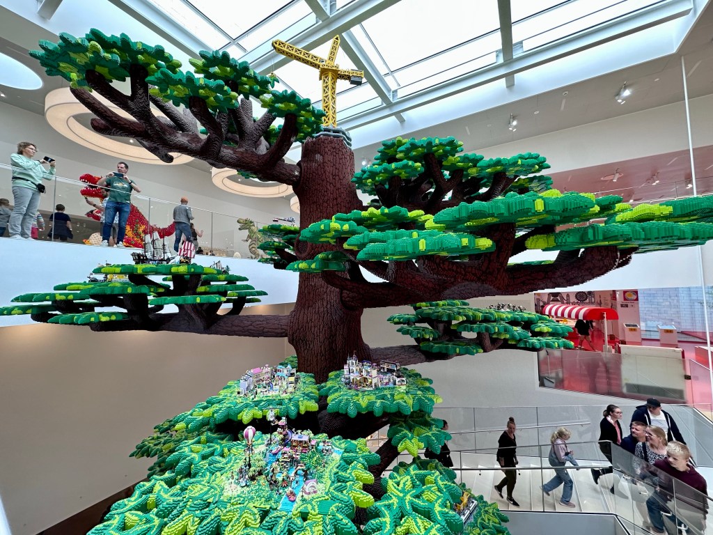 A questo punto si può entrare dai tornelli e salire verso la prima sala da una grande scala centrale, che gira attorno ad un immenso albero di Lego, sulle cui fronde campeggiano buffi diorami tematici delle più note ambientazioni.