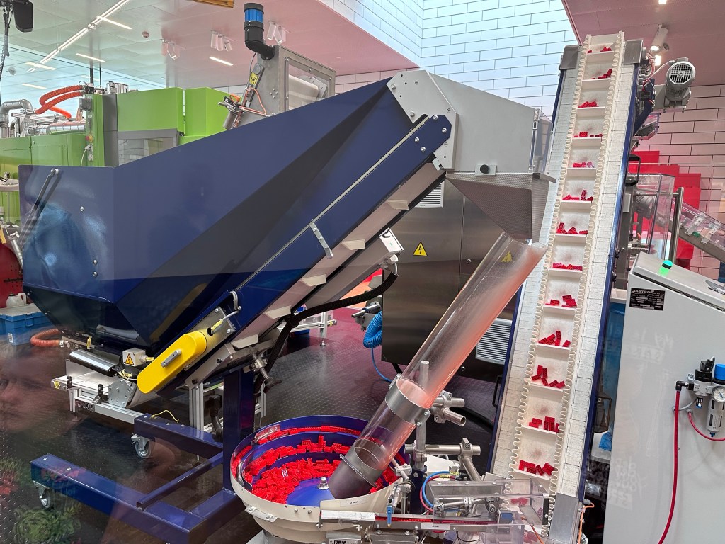 - Nell’ultima sala c’era un buffo filmato d’animazione che spiegava che con 6 classici mattoncini da 6 è possibile realizzare oltre 195 milioni di combinazioni. Il terminale della sala ti stampava una tessera con il tuo nome e la tua unica combinazione di mattoncini. Poi, lì accanto un macchinario industriale stampava e confezionava le buste con il set da 6 mattoncini, per realizzare la tua creazione unica