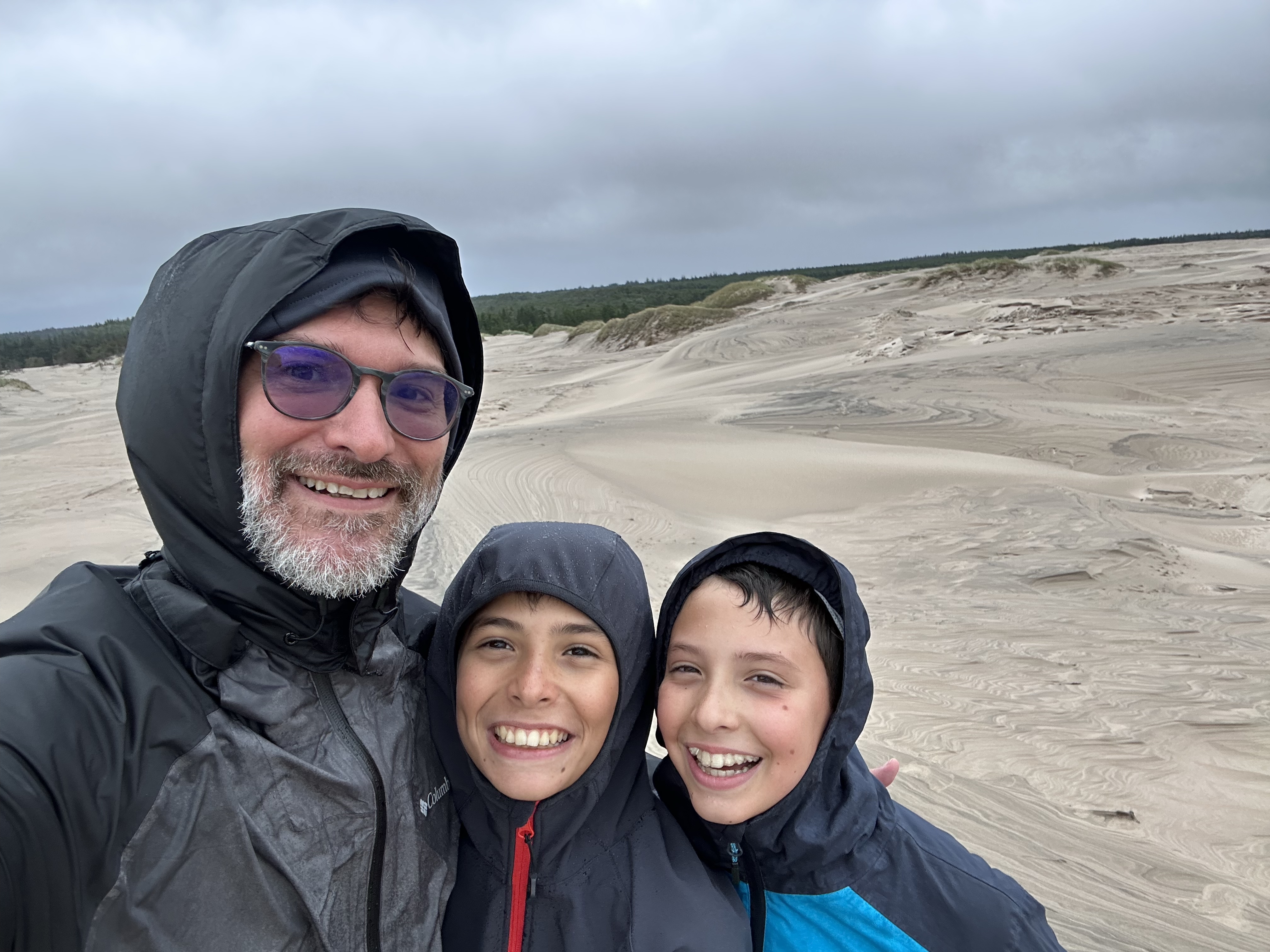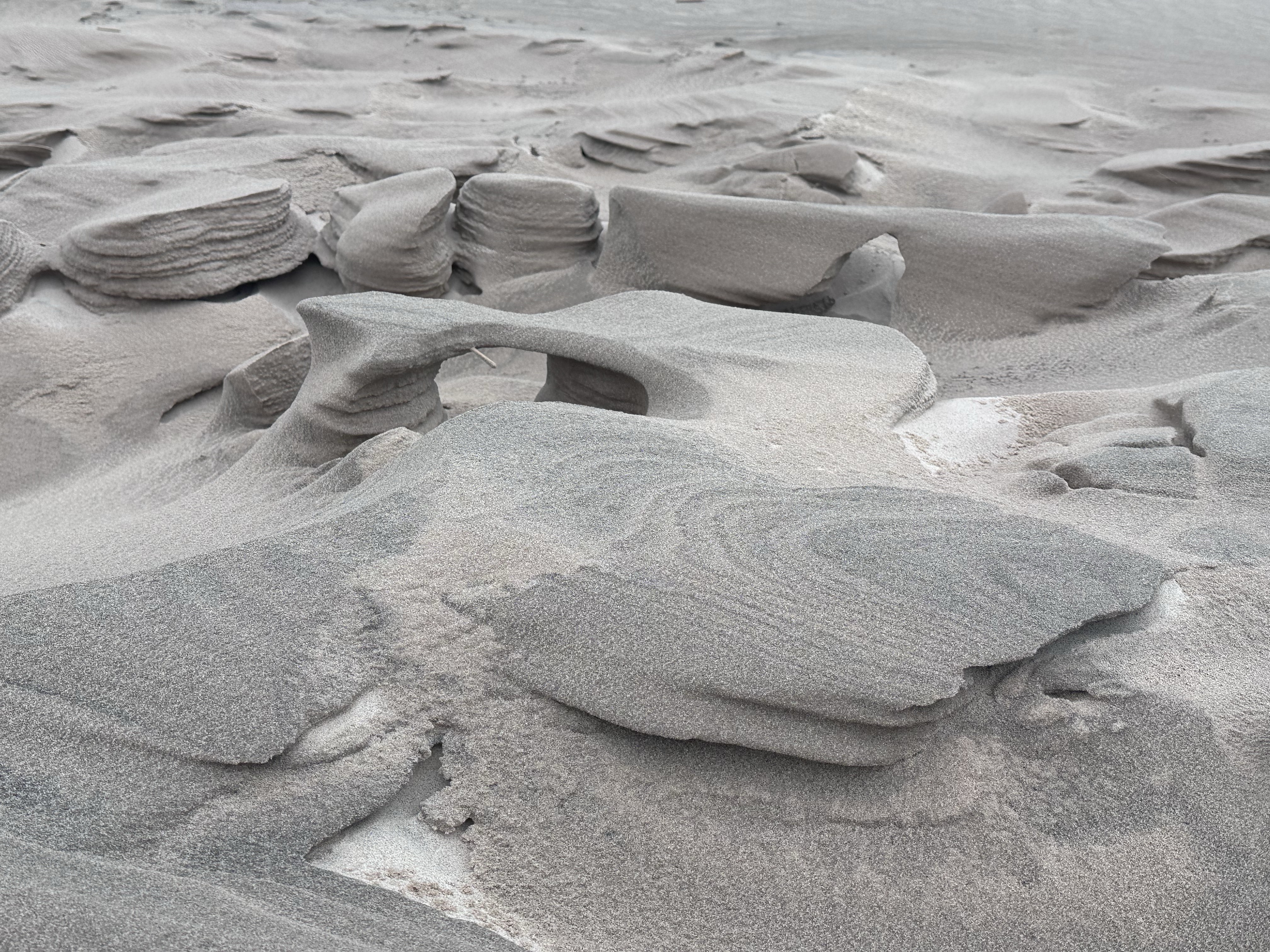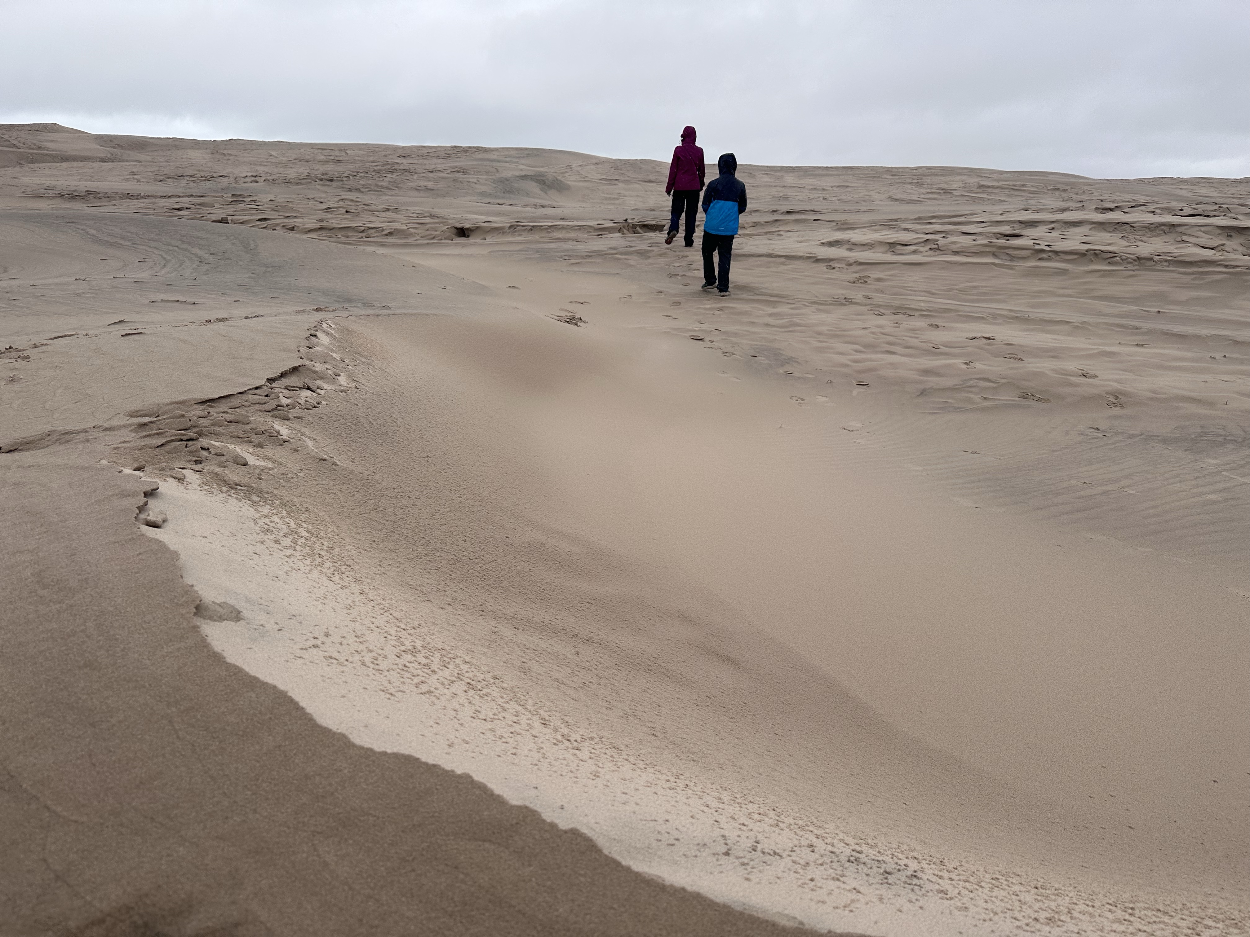 Cosí bardati di tutto punto ci arrampichiamo con la pioggerellina ed il vento che ci sferza il viso. Il paesaggio ci lascia a bocca aperta, le dune inumidite dall’acqua non sono friabili sotto i piedi come ci si aspetterebbe. Inoltre a seconda di come vengono accarezzate dal vento, creano diverse consistenze, colori, creste e forme in continua evoluzione.