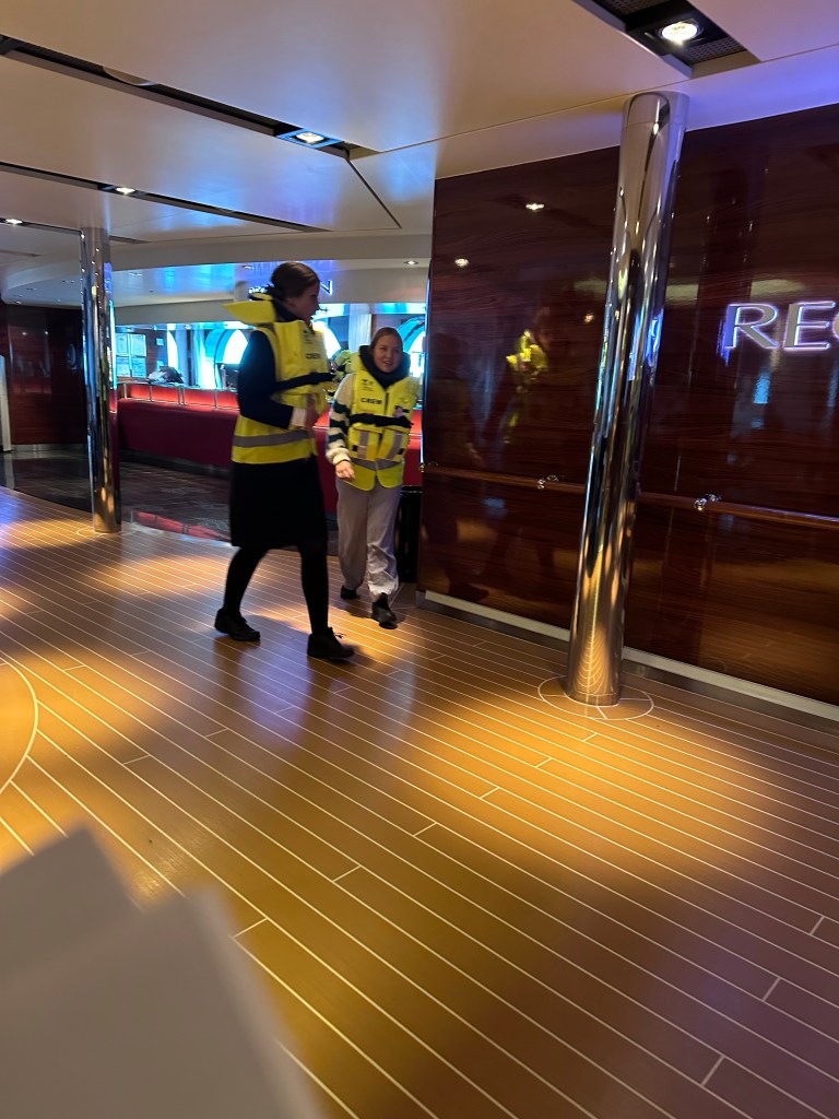 Ad interrompere la monotonia del viaggio ci pensano i simpaticoni degli annunciatori che dal Bridge mandano messaggi di allarme, dichiarando che c’è un incendio a bordo e che tutta la crew deve radunarsi nei saloni, indossare giubbotti salvagente e poi recarsi alle scialuppe di salvataggio. Nonostante questo vediamo la gente attorno a noi, per lo più serena e tranquilla che continua a leggere, giocare a carte, ingozzarsi di cibo. Quelli preoccupati sono solo i passeggeri che non hanno sentito “questa è una esercitazione, non riguarda i passeggeri”. Per fortuna alla seconda volta che il messaggio è stato ripetuto, dopo la sirena dall’allarme, abbiamo sentito anche la premessa e i bambini hanno tirato un sospiro di sollievo.