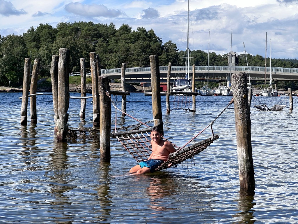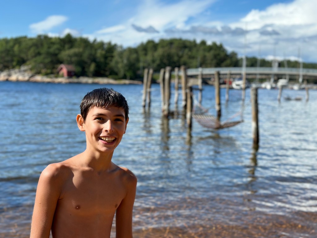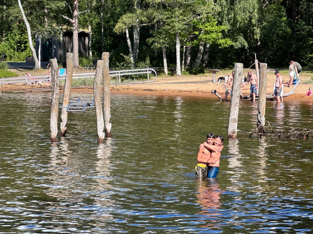 E alla fine si arriva in una spiaggia che sembra in un parco cittadino, con tavoli da picnic, giochi, docce all’aperto e persino lo scivolo per permettere ai portatori di handicap di farsi un bagno. Qui, in meno di 3 minuti, i ragazzi sono già in costume e poi subito in mare a sguazzare e giocare. L’acqua non è troppo fredda, siamo riparati dal vento ed il sole davvero piacevole.