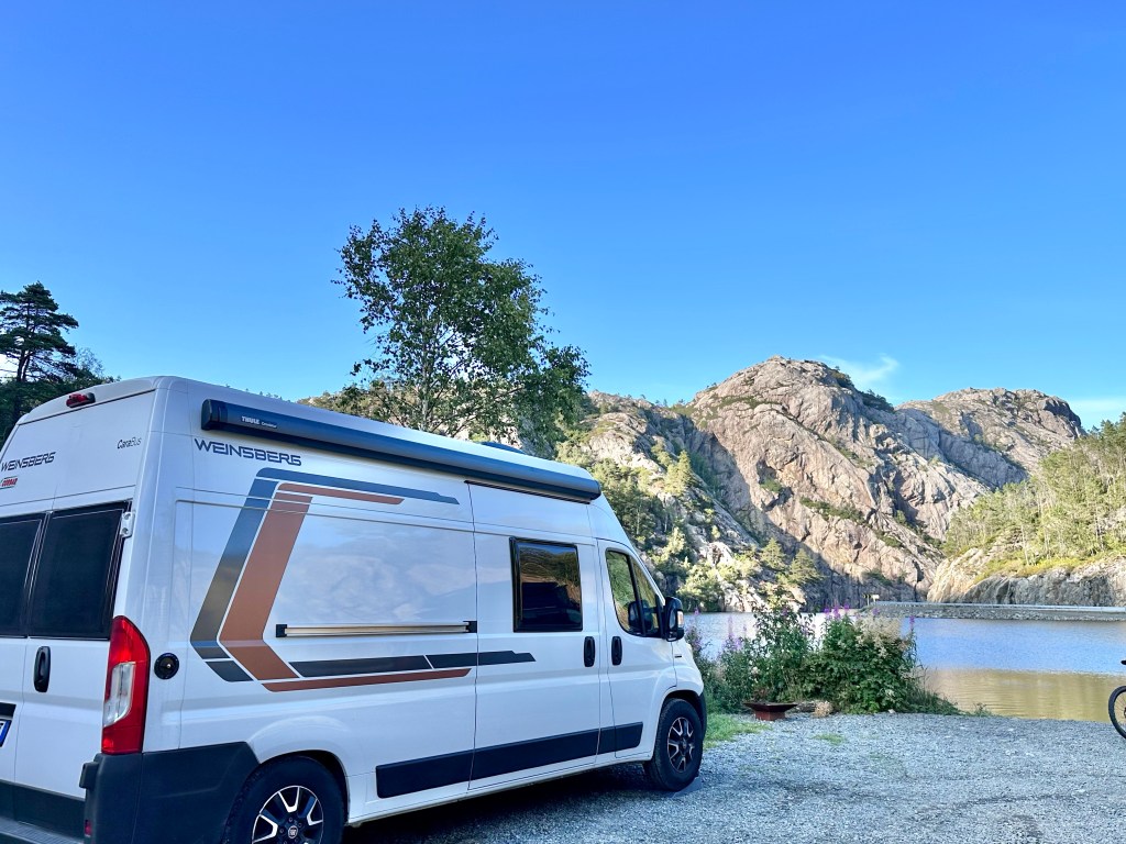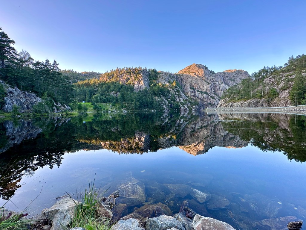 A proposito di strada, siamo molto curiosi di vedere queste “scenic routes” o “natjonale turistweger”, perché a noi gia le strade comuni, già subito da fuori Kristiansand e poi fino a Flekkefjord già hanno donato continui scorci meravigliosi. Ponti su fiordi, cascate, torrentelli, isolotti, laghetti… Ovviamente siccome sono al volante non ho potuto fare foto, ma percorrere queste strade con della buona musica, il cielo azzurro ed il sole è qualcosa di estremamente gratificante.