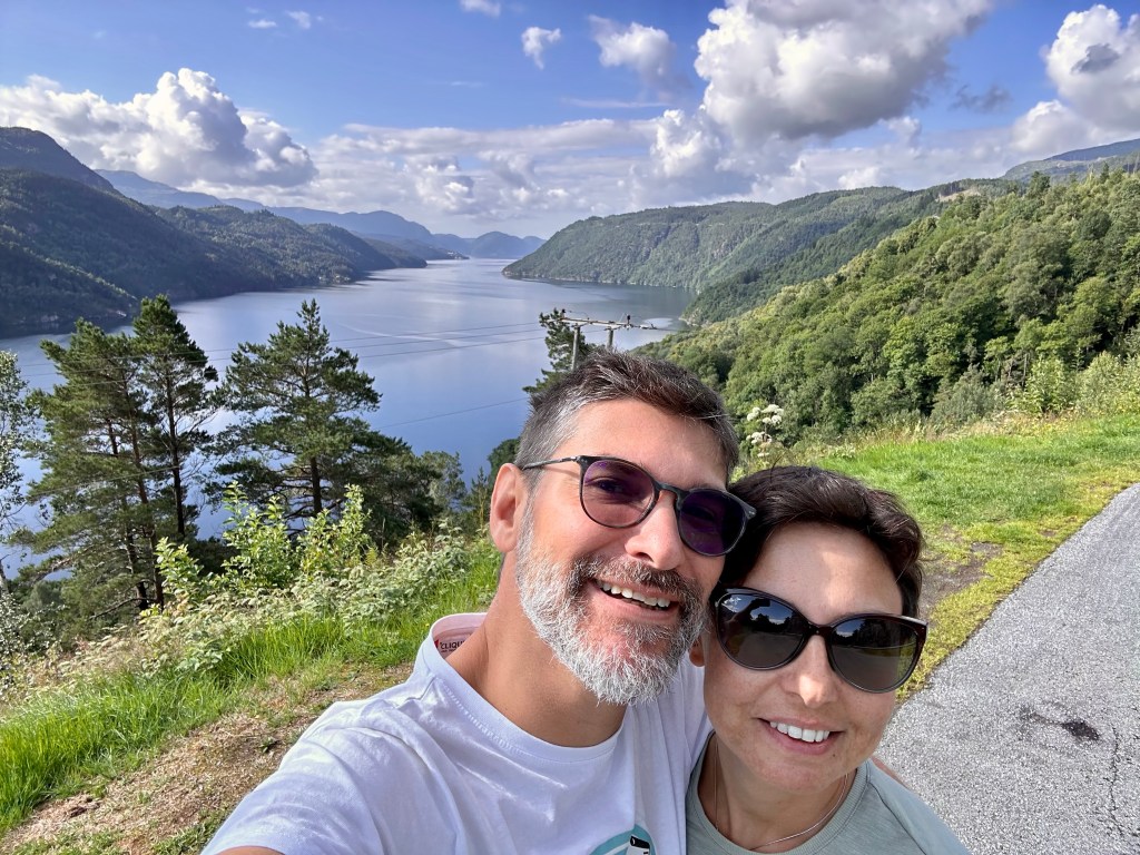 Ci svegliamo anche oggi con calma e, dato che il sole splende sul nostro accampamento stendo gli accappatoi ad asciugare. Sistemiamo un po’ il camper e finalmente ripartiamo alla volta di Sauda, cittadina molto graziosa come al solito affacciata su un fiordo e nei pressi di tre cascate che vanno direttamente a tuffarsi in mare.