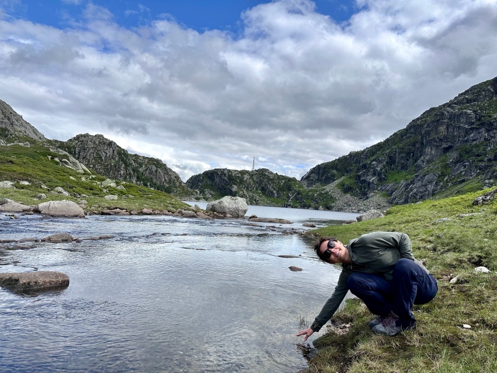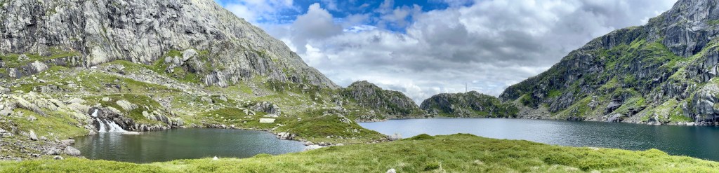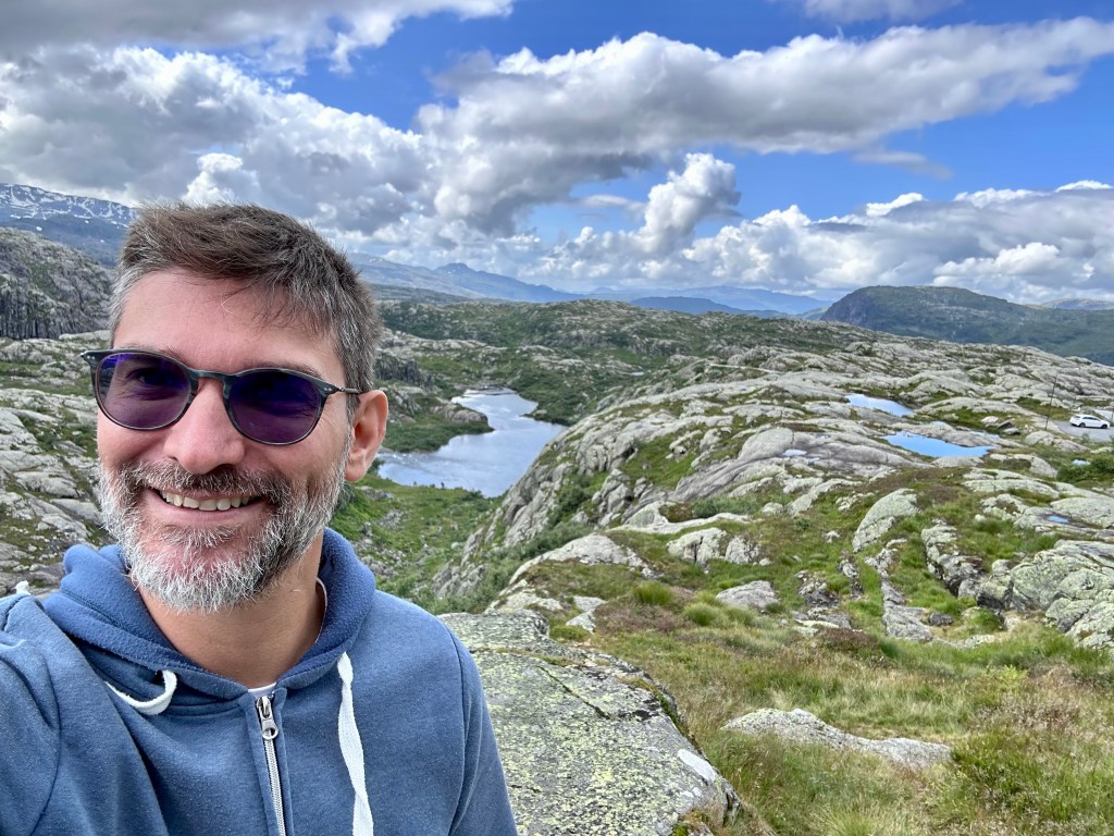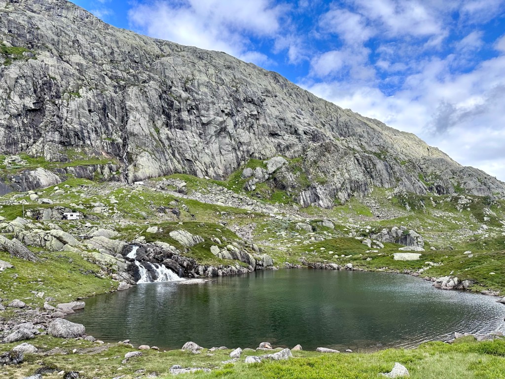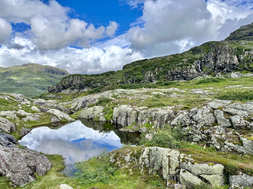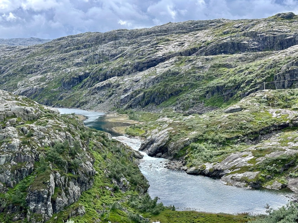 Ma la cosa che più ci ha colpiti è il tratto di strada tra Sauda e Roldal, che essendo più in quota regala un paesaggio da alta montagna a queste latitudini. La vegetazione si fa più bassa, composta da arbusti e muschio. Chiazze di neve e ghiaccio imbiancano le cime, mentre polle d’acqua immobile riflettono il cielo e le nubi come specchi. Ci mettiamo molto a percorrere questo tratto, perché ad ogni piazzola ci dobbiamo fermare per fare foto e assaporare con calma questo nuovo tipo di paesaggio, che rasserena e induce alla riflessione. Inoltre ci piace molto il fatto che siamo praticamente solo noi ed un altro piccolo camper olandese, in questo sconfinato deserto verde, oltre alle numerose pecore che spesso ci attraversano la strada.