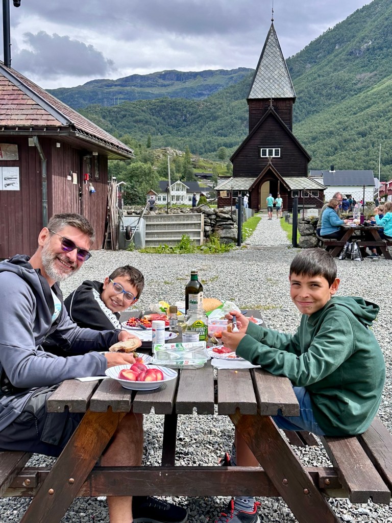 Poi con un imponente ponte attraversiamo il fiordo e lo percorriamo, sostando spesso alle numerose aree picnic per osservare il panorama, fino alla graziosa cittadina di Norheimsund. Anche lei con porticciolo sul fiordo ed immancabile cascata. Ci fermiamo a dormire su un ampio piazzale dietro alla chiesa e poi facciamo due passi, decidendo poi di fermarci a cenare ad un buon risorante Thailandese.