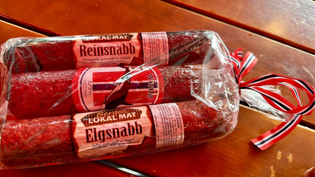 Alle 13 iniziamo a sentire un certo languore, decidiamo così di sfamarci al famoso mercato del pesce di Bergen, altra attrazione acchiappa turisti. Ormai del mercato vero e proprio c’è poco, sono più che altro food truck stabili o chioschi/ristoranti sul porto. Ma dato che ad una bancarella c’è un simpatico conterraneo di Ancona, che ci offre un assaggio di salami di Renna, Alce ed Orca, decidiamo di acquistare un questo tris di improbabili salumi. Ne approfittiamo per ottenere una breve intervista su come si vive a Bergen e come sia di inverno (a quanto pare meglio che d’estate). In cuor nostro sappiamo di essere caduti in una trappola per turisti, ma oggi abbiamo deciso che oggi ci va bene così.
