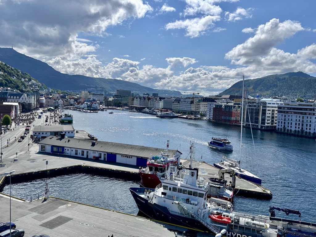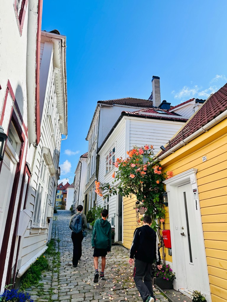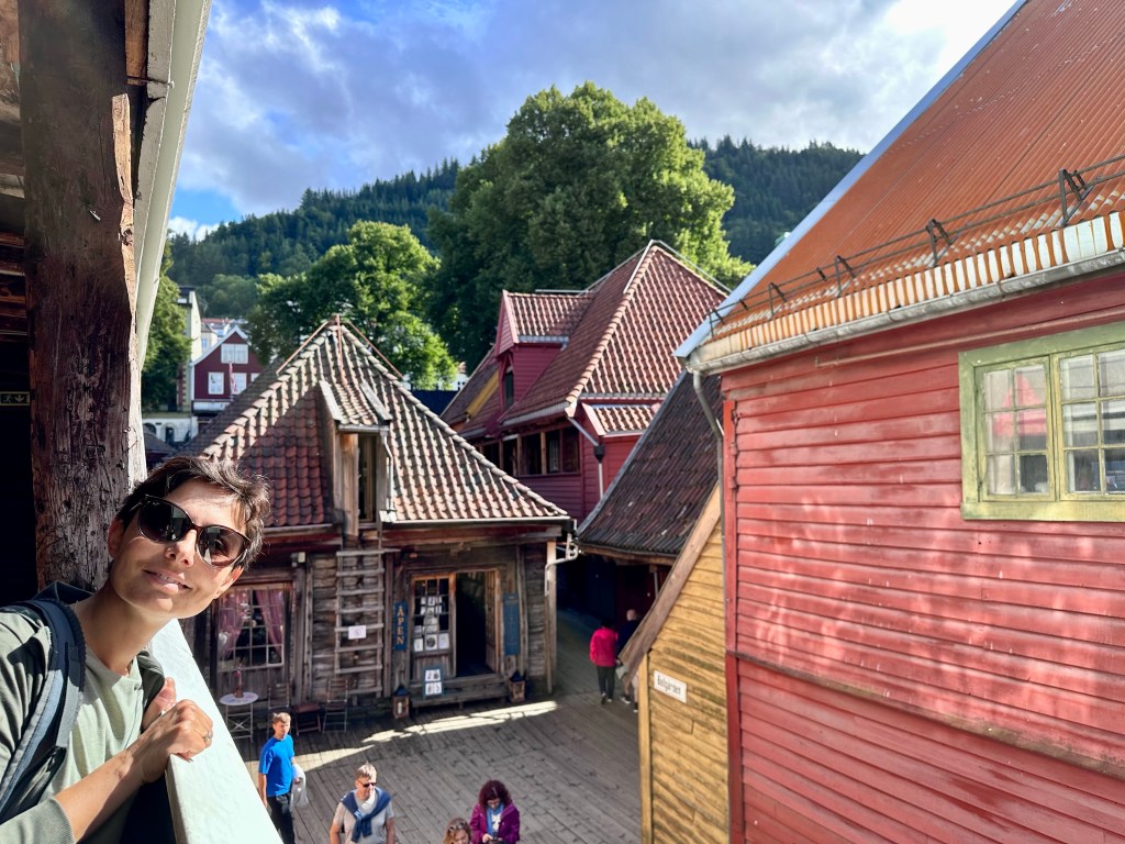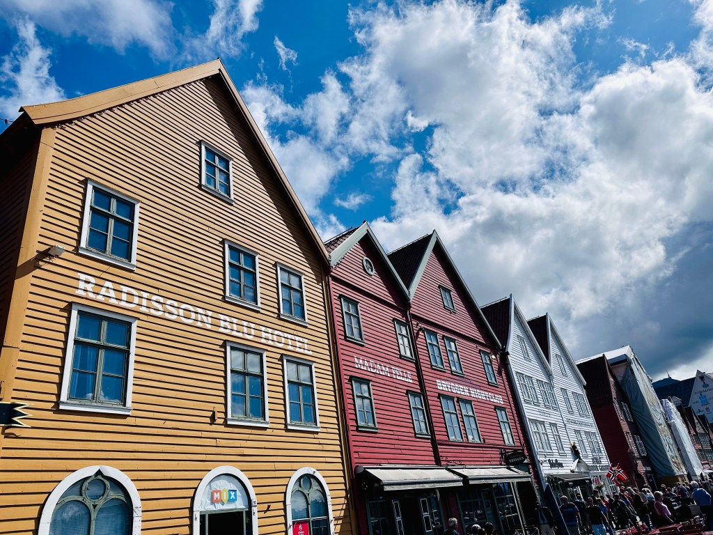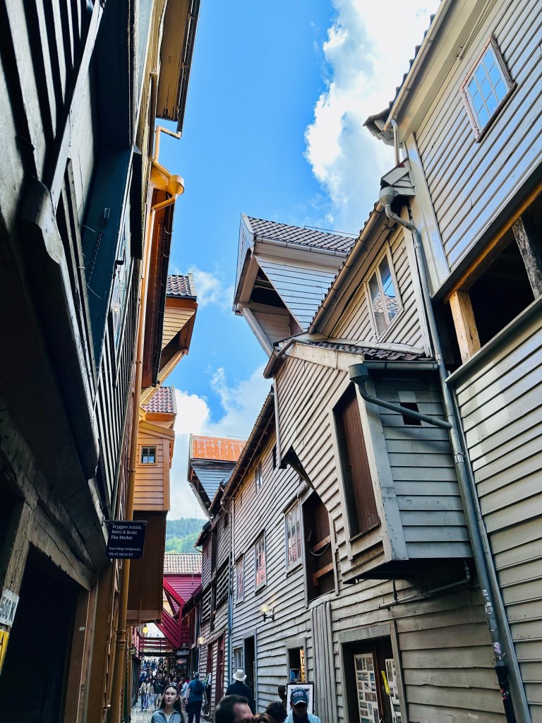 In pochi minuti arriviamo al famosissimo Bryggen, ovvero il quartiere del vecchio porto, che era stato fin dai tempi del Medioevo, il centro di potere dei ricchi mercanti tedeschi della Lega Anseatica. Per i profani è quella schiera di casette di legno, un po’ inclinate affacciate sul porto, in pratica il simbolo e cartolina di Bergen, nonché patrimonio UNESCO.