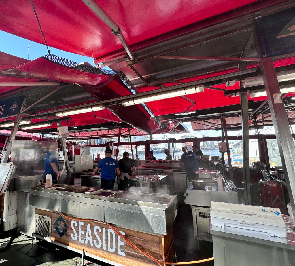 Pranziamo velocemente con un fish and chips molto buono ed abbondante ed un paio di panini con salmone affumicato e gamberi. Saltiamo senza rimpianti, la possibilità di assaggiare le bistecche di balena ai ferri.