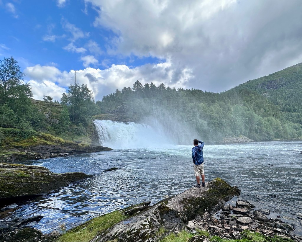 Prendiamo un altro traghetto e ci fermiamo spesso lungo il tragitto. Ogni volta che una delle numerose aree sosta/picnic lungo la strada ci permette di sgambettare verso un torrente o una cascata o punto panoramico.