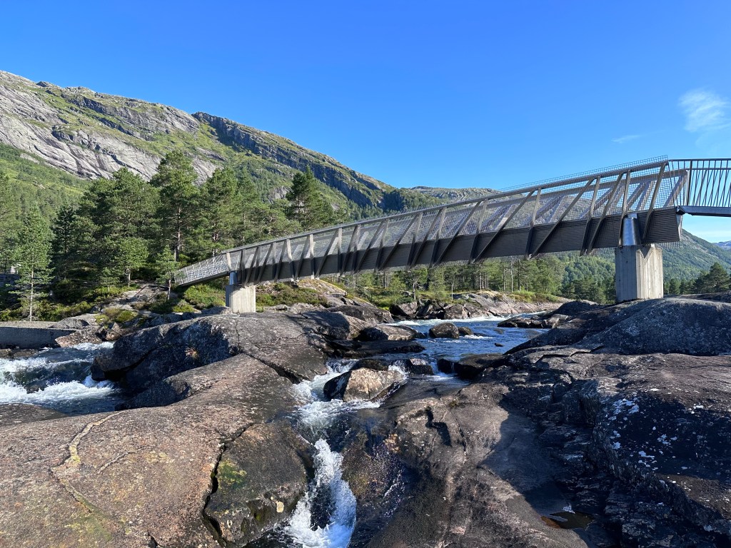 Ci fermiamo dopo poco ad una bella area sosta su un torrente, da cui partono svariati sentieri di passeggiate, che conducono alle numerose cascate della zona. Noi facciamo un giretto di qualche minuto, attraversando un ponticello di metallo sulle rapide.