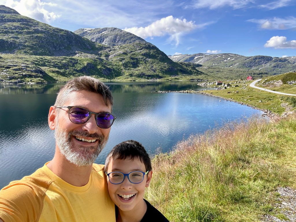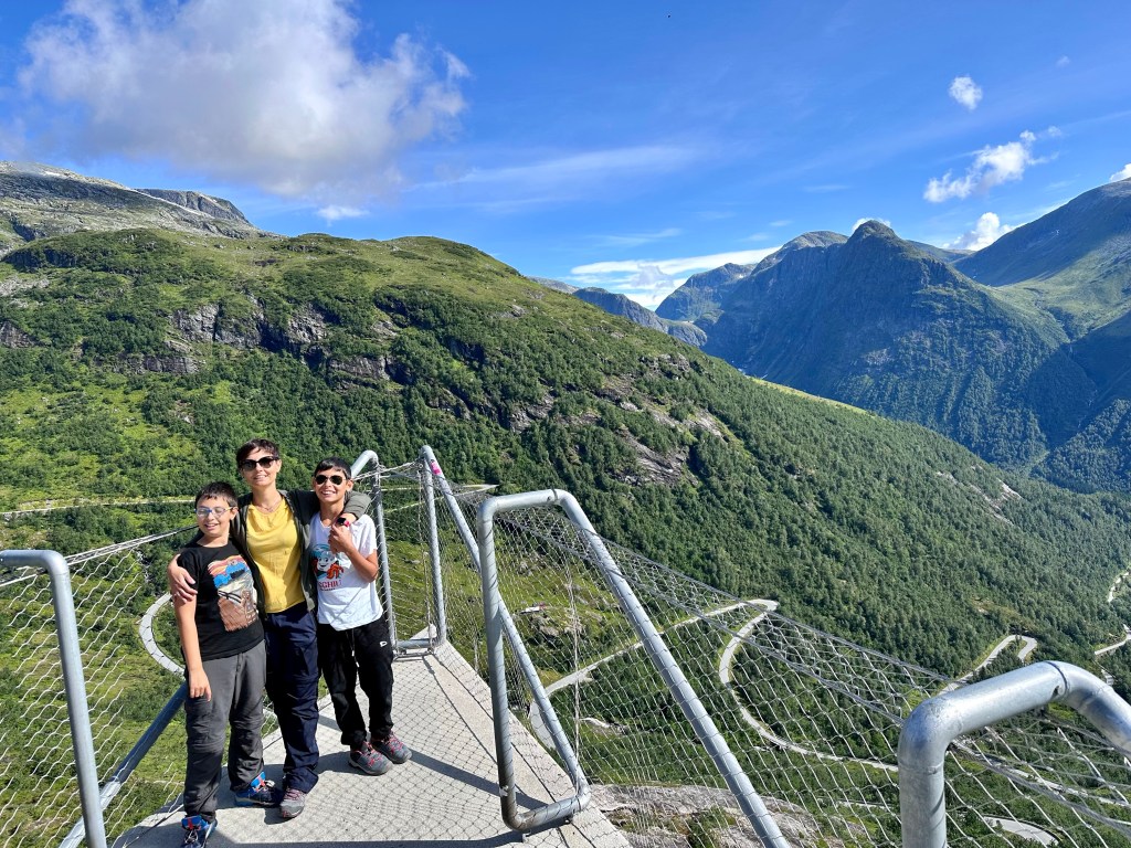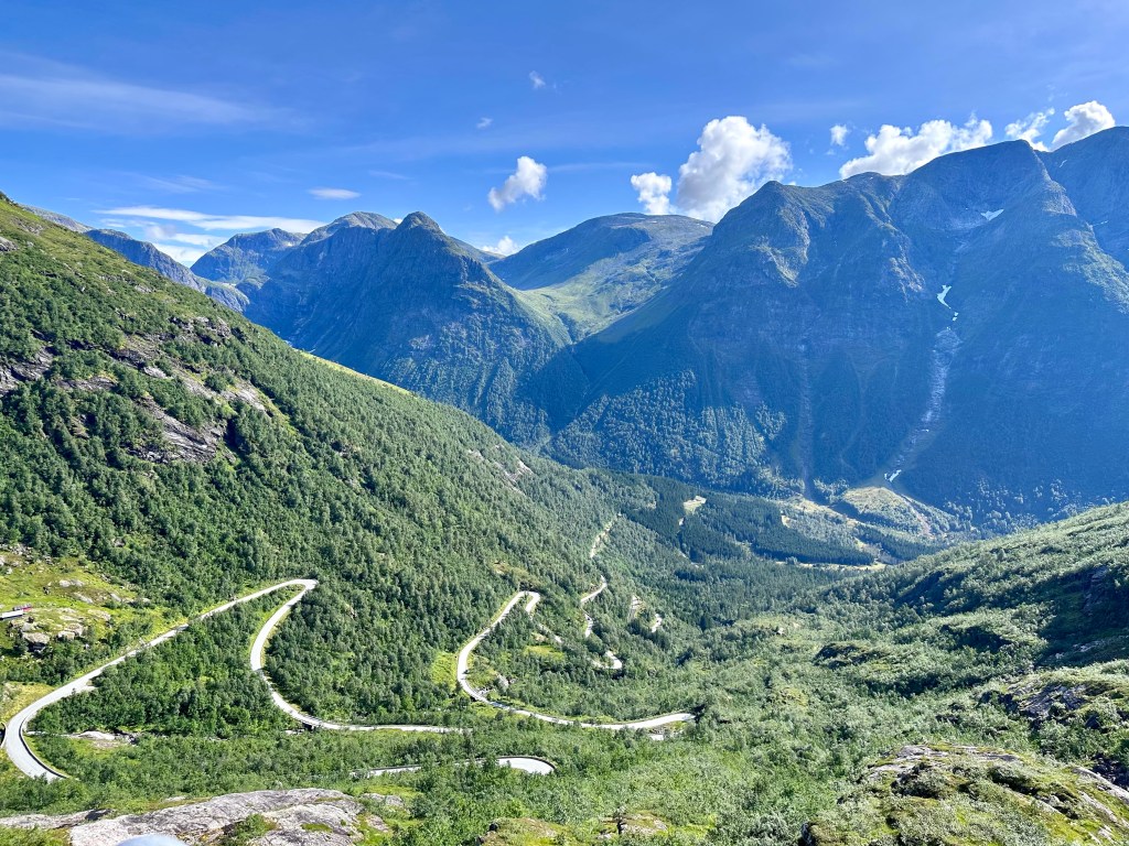 La strada prosegue, con solite soste continue per foto e filmati dai finestrini. Ad un certo punto arriviamo ad uno spettacolare spiazzo panoramico con tre punte di cemento, da cui ammirare la valle sottostante e la strada dai mille tornanti che dovremo percorrer per scendere al Sognefjord. Questo è il fiordo più lungo di Norvegia con i suoi 204 km.