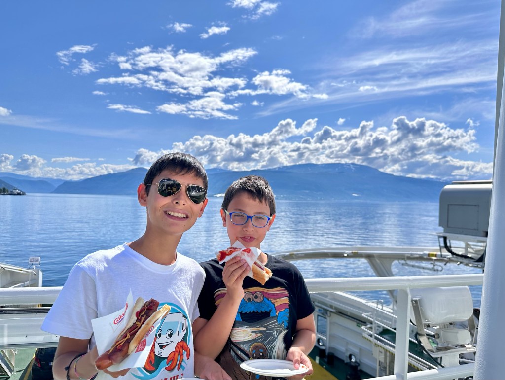 Qui facciamo una veloce spesa e poi andiamo a prendere il traghettino per la riva opposta. I ragazzi approfittano per mangiarsi un hotdog. In tutti i traghetti, c’è il bar con panini caldi, e Domenico adesso vuole sempre traghettare.