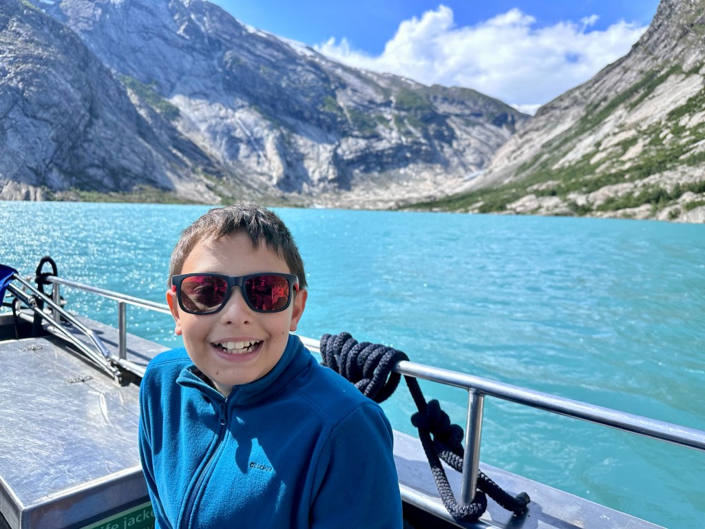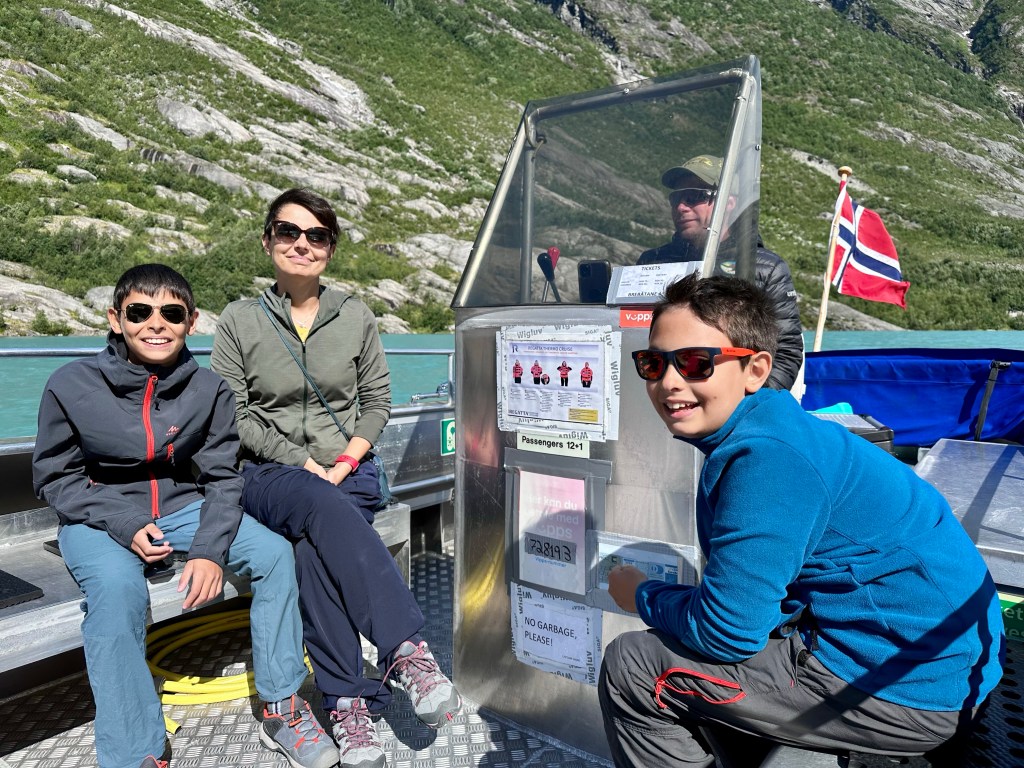 Arriviamo al parcheggio sul laghetto glaciale e scendiamo al pontile da cui partono i motoscafi che conducono al punto di partenza della passeggiata. Dalla barca, osservare attorno a noi la conca scavata dal ghiacciaio è impressionante, decisamente immensa, inoltre dalle sue alte pareti quasi verticali scendono svariate cascate che confluiscono nel lago.