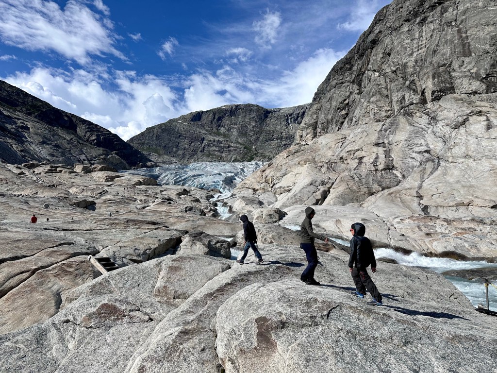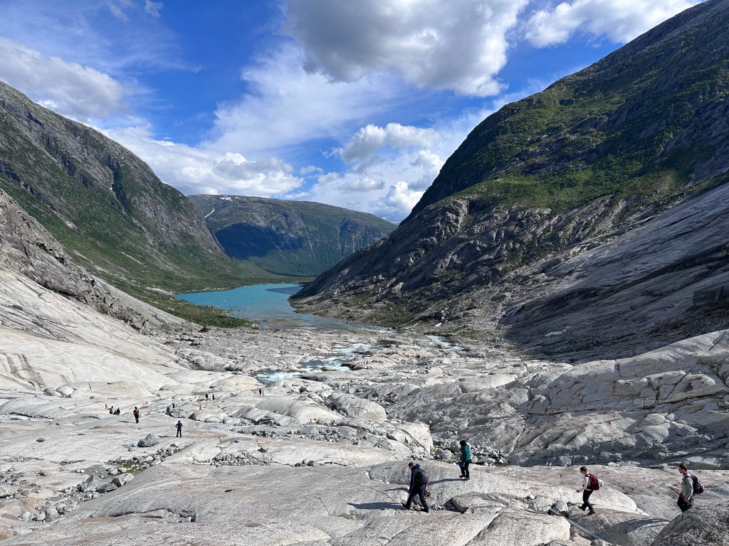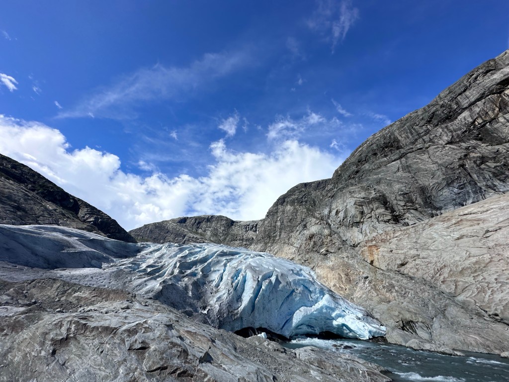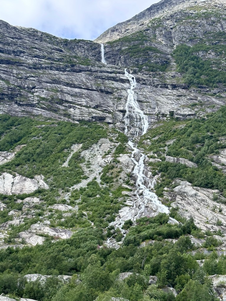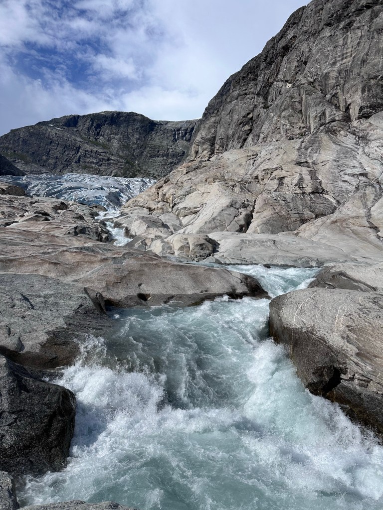 Andiamo avanti, lungo le rive del fiordo fino a Gaupne e da lì iniziamo a risalire, costeggiando un impetuoso torrente verdino. Resistiamo a fermarci perché ormai sono quasi le 15 e vogliamo arrivare a Nigardsbreen, ovvero una delle lingue più accessibili dell’enorme ghiacciaio Jostedalsbreen, il più grande dell’Europa continentale (Islanda esclusa in pratica).