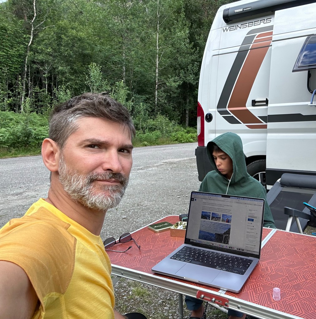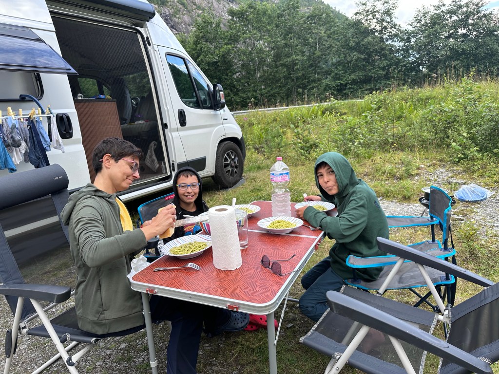 Approfittiamo dell’esserci fermati prima del solito per fare un bucato di biancheria e fare una cosetta di lavoro. Poi aperitivo e cena con pasta al pesto.