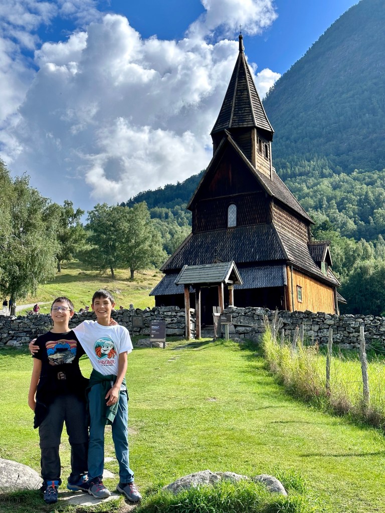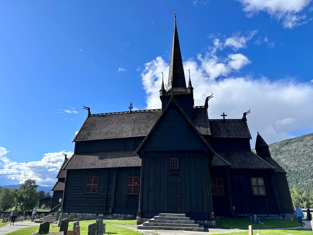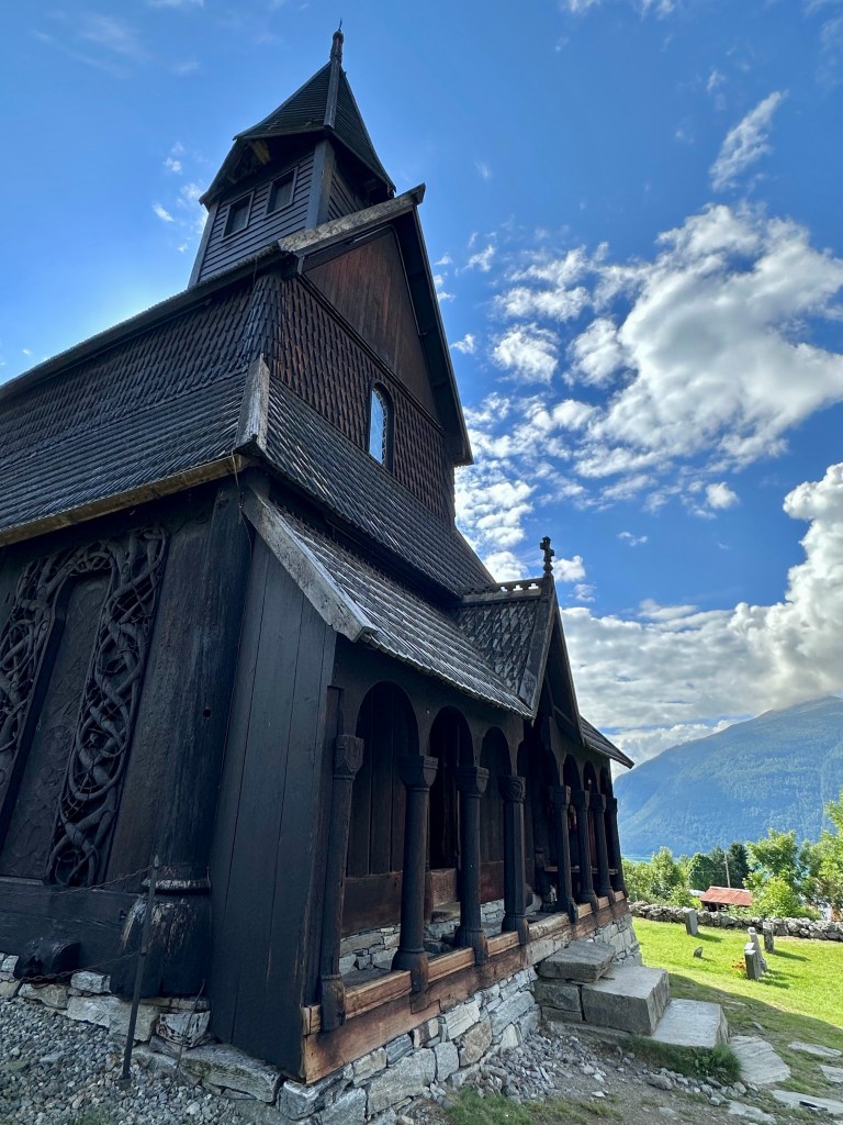 La chiesa è molto particolare, la più antica di tutta la Norvegia e ben conservata anche all’interno, oltre che a trovarsi in un punto davvero panoramico con vista sulle acque verdi del fiordo. Un giovanotto allampanato con i baffoni calanti ci spiega bene tutto quanto, rendendo la visita anche piuttosto didattica, il che è bello ed istruttivo. Ad esempio, lo sapevate che le stavkirke sono così scure perché sono incatramate per renderle impermeabili e resistenti alle intemperie, esattamente come si faceva con gli scafi delle navi vichinghe? E hanno infatti un odore simile a quello dell’incenso, visto che è una pece che si ottiene facendo cuocere le resine vegetali.