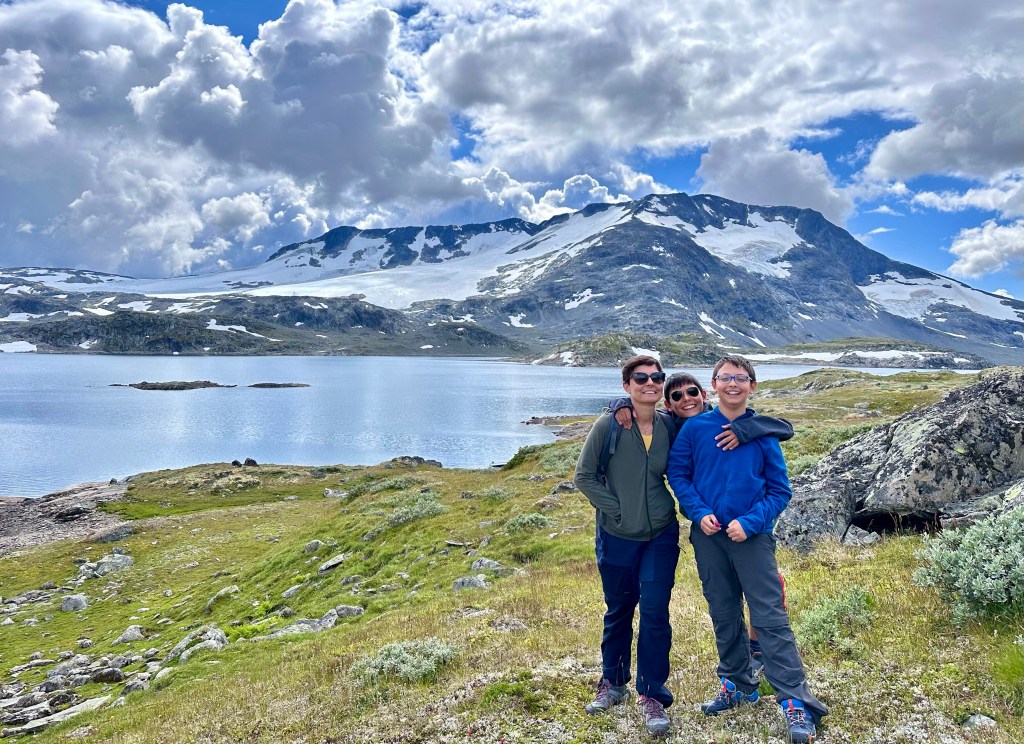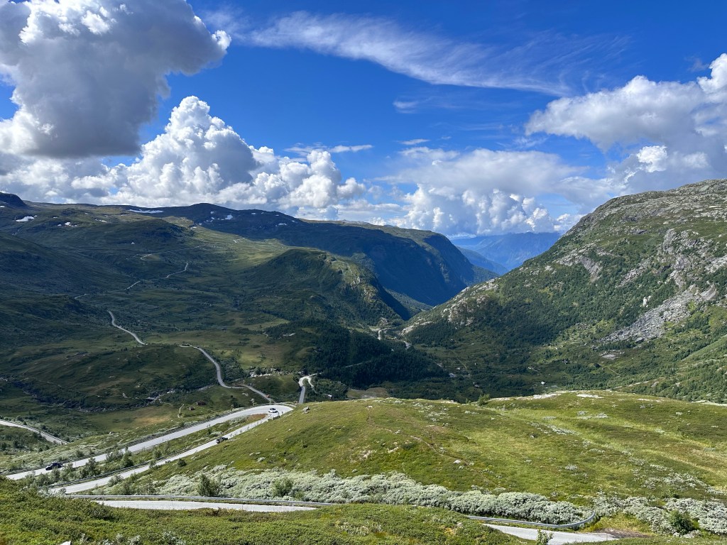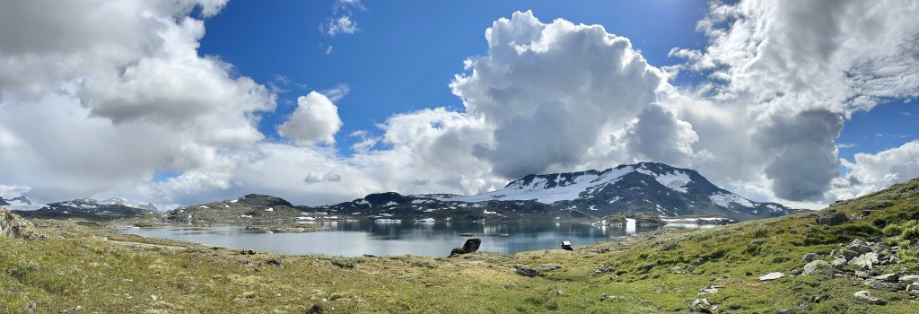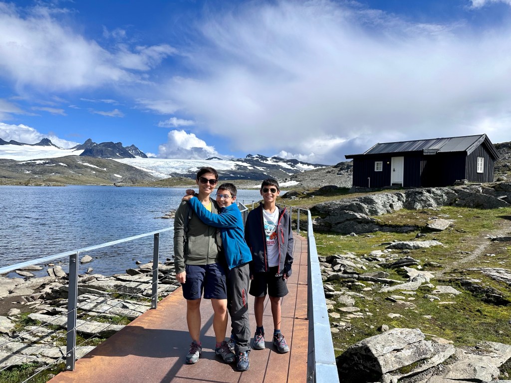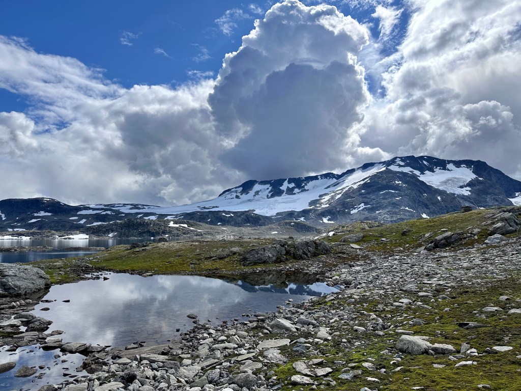Facciamo una camminata anche qui, scattiamo millemila foto e capiamo sempre di più perché si chiami Jotunheim, ovvero casa (heim) dei giganti (jotun). Il luogo offre un senso di immensità e le montagne, coperte di ghiacci dai riflessi blu, sembrano effettivamente immense creature addormentate su letti di muschio.