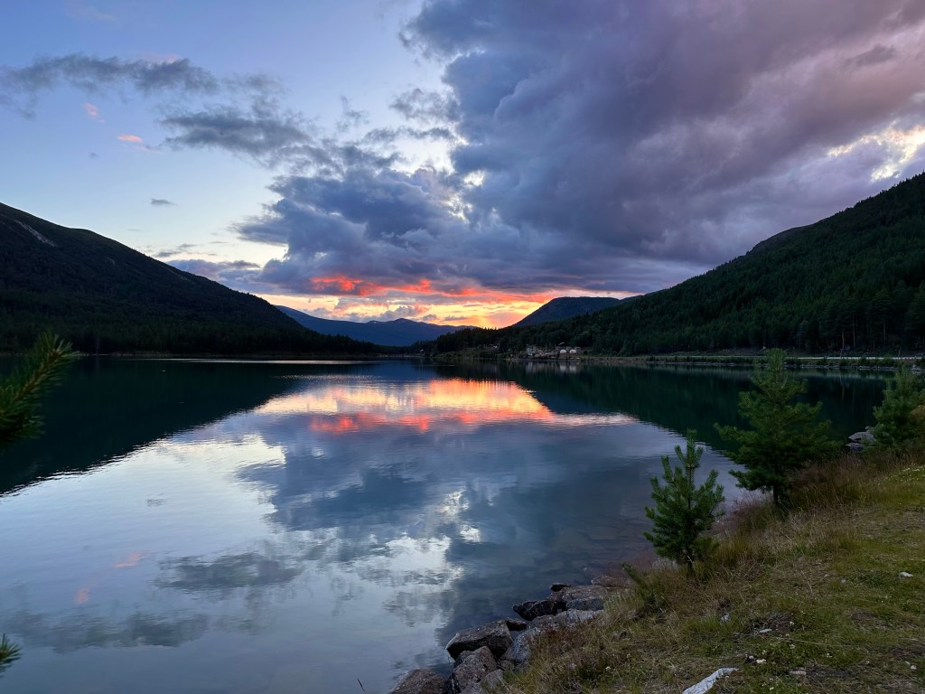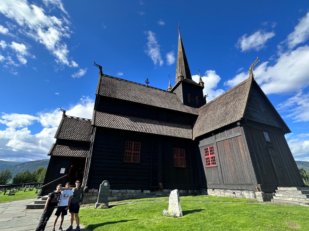 Arriviamo a Lom, ormai alle 18. La cittadina sembra una località di villeggiatura montana, con tante caffetterie, ristoranti, hotel e negozi. Qui le case non sono bianche e rosse, come quelle sulla costa, ma di un marrone scuro che fa più montanaro. Coincidenza anche qui c’è una Stavkirke, che sorge in mezzo ad un bel prato curato in mezzo alle lapidi di un piccolo cimitero. Ma questa ha la particolarità di avere i caratteristici “cornini” a foggia di drago, che ricordano le polene dei drakkar. Questa vince il trofeo della chiesa più vichinga del viaggio.