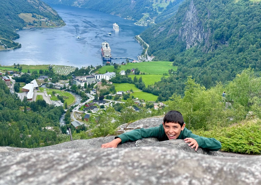 Arriviamo in cima e ci troviamo del tutti avvolti dalle nuvole, che strisciano verso l’alto lungo il pendio. Al di là di esse, ci attende una serie di tornanti che conducono a Geiranger, porticciolo incastonato in fondo a un fiordo molto stretto e con pareti particolarmente alte e scoscese.