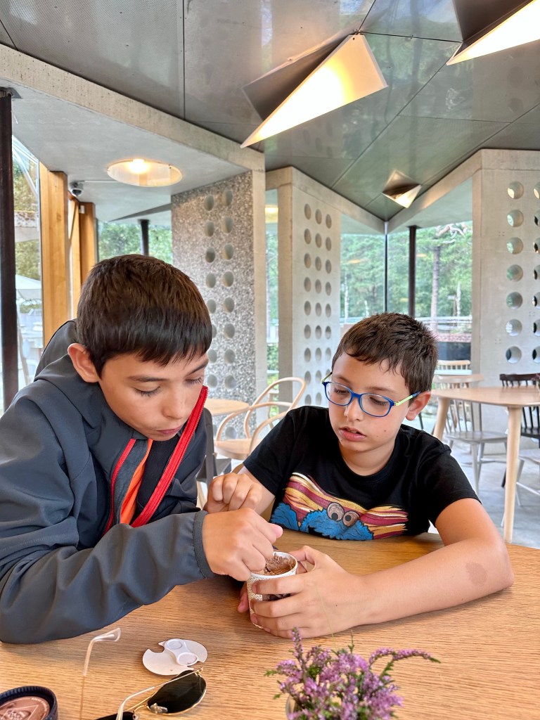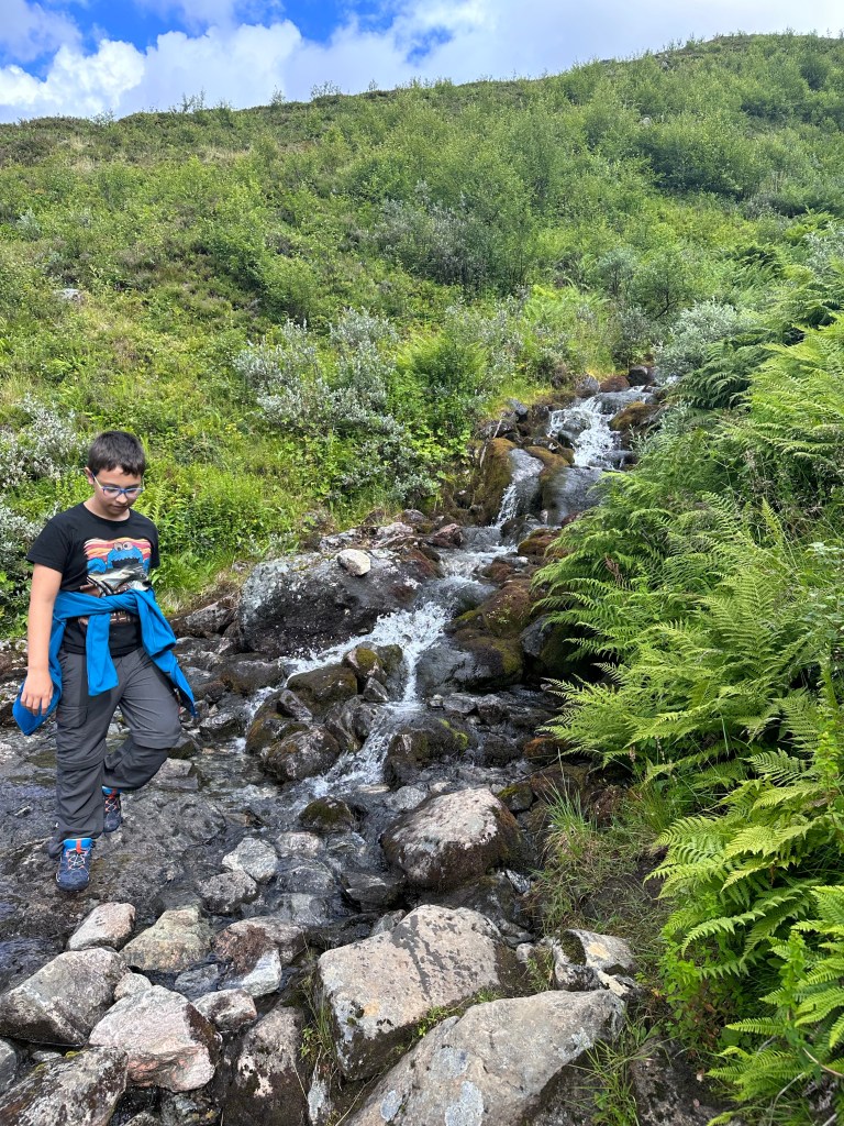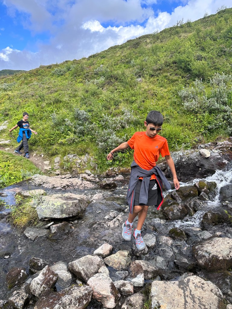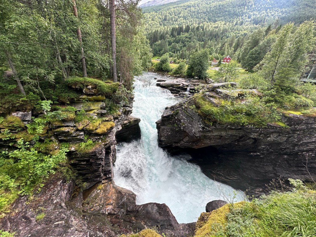 Durante la salita ci fermiamo presso delle Fossen (cascate) per fare merenda con un costoso gelato artigianale al latte di capra, una ottima brioche alla cannella ed un buon caffè americano, con vista sulle acque tumultuose.