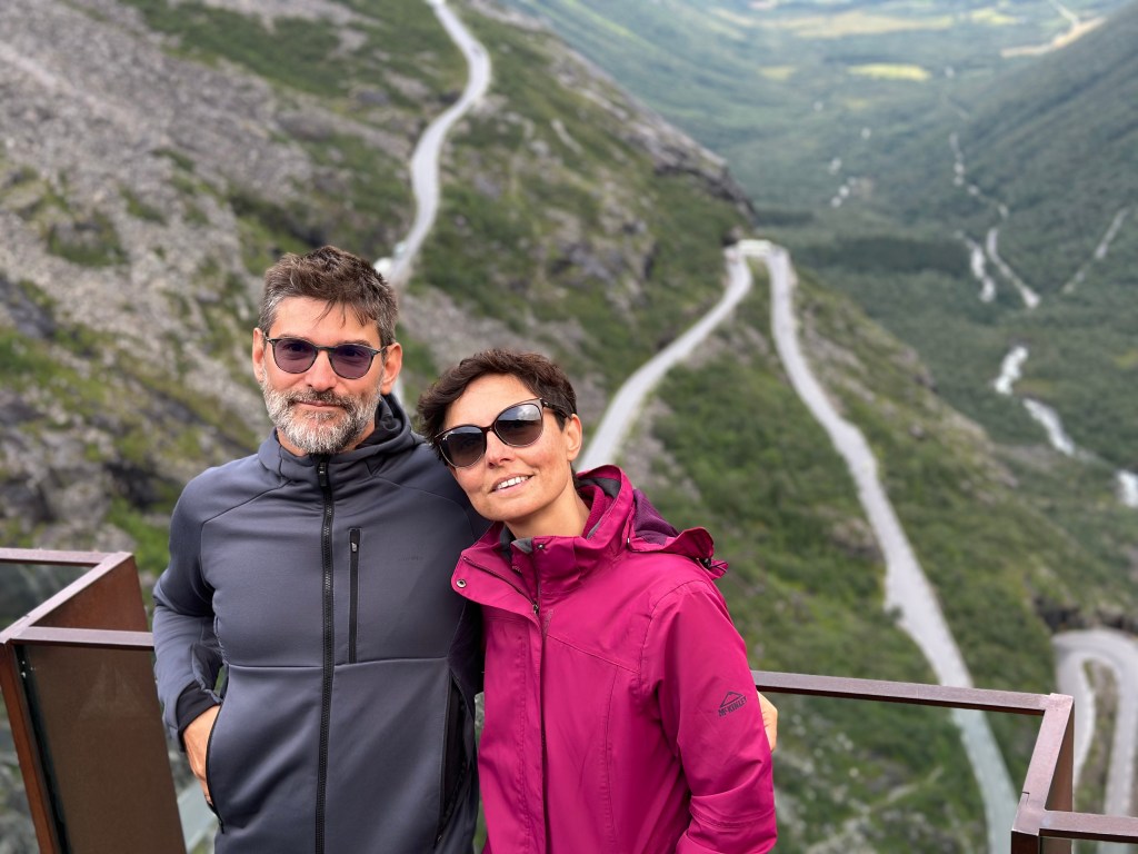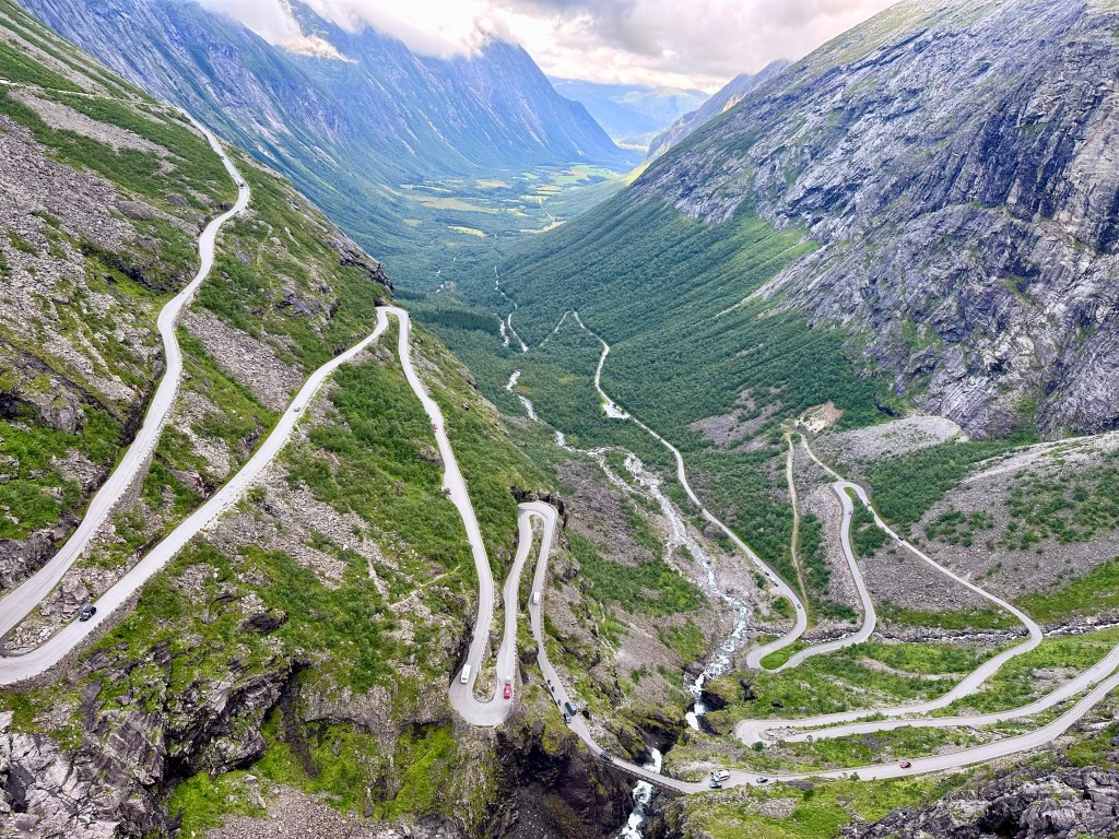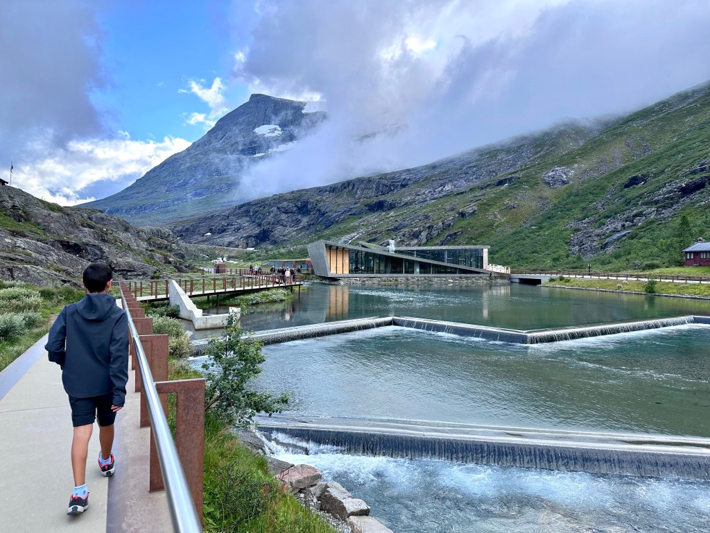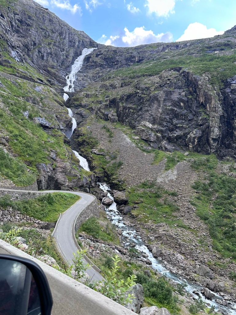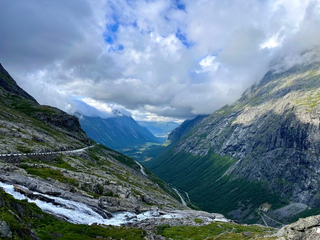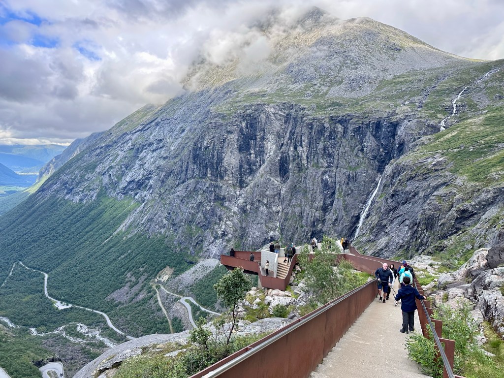 Il tratto finale della strada è la terza (ed ultima della giornata) sequenza di tornanti. Prima di esso si trova un moderno centro visitatori, con i suoi sentieri cementati e terrazze sull’immenso strapiombo. Qui si ha un senso di meraviglia di fronte ad una natura titanica che è paragonabile a quello di altre location famose come il Grand Canyon. La valle, che si apre a precipizio sotto di noi é immensa e ripidissima, contornata da due alte cascate che si riversano dai due lati opposti. La strada sottostante disegna sul paesaggio un ghirigoro che sembra quasi una cicatrice sul volto truce del troll. Percorriamo tutti i camminamenti per vedere la vallata da ogni angolazione possibile.