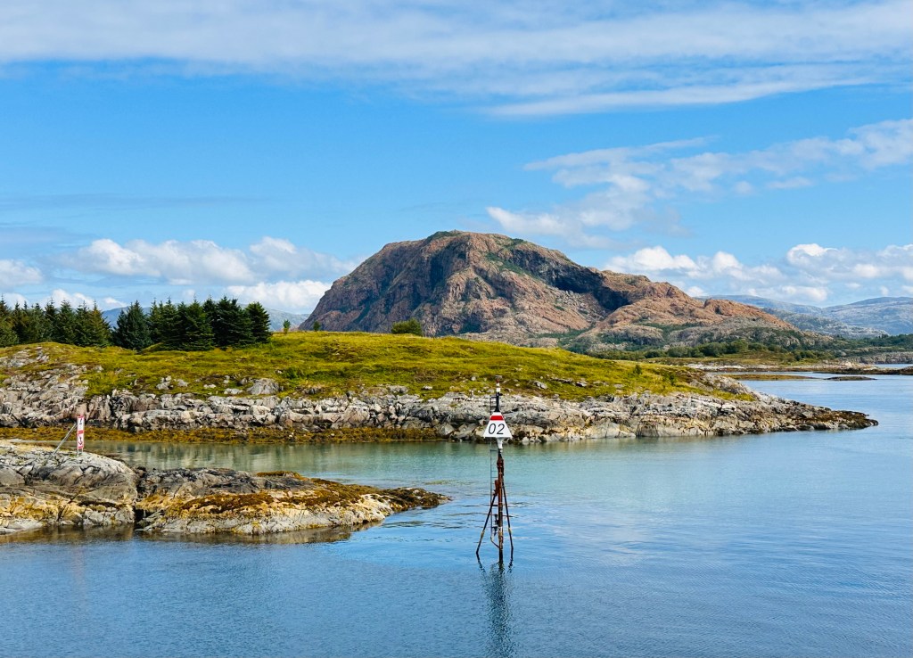 Il secondo dei traghetti di oggi, ha fatto una tratta più lunga, per portarci fino all’isola di Alsta, la cui sagoma montuosa già si vedeva dal mare con il suo alto profilo a denti di sega. Resto quasi tutto il tempo del viaggio sul ponte, approfittando della bella giornata, per fare foto e filmati. Intanto indovinate un po’ i ragazzi si pappano il solito Hot Dog.