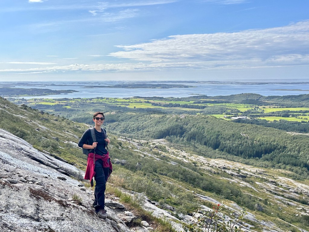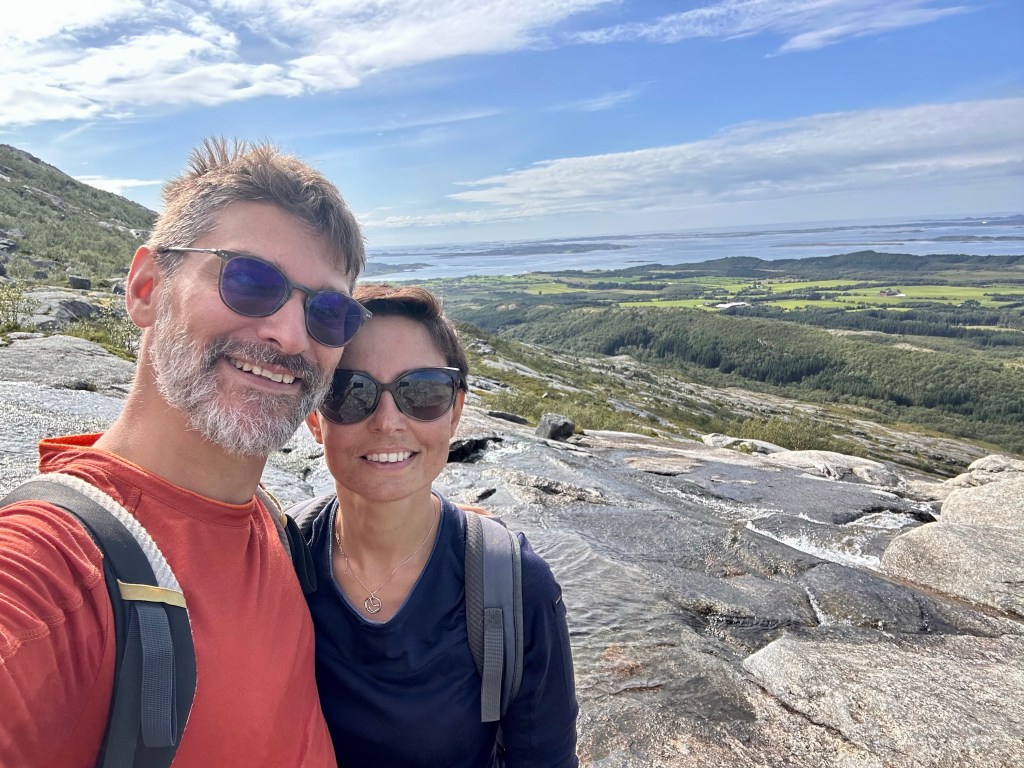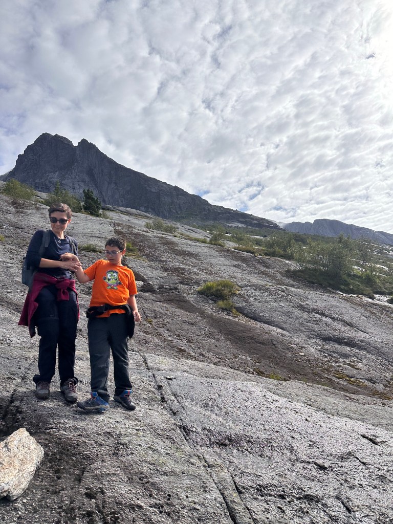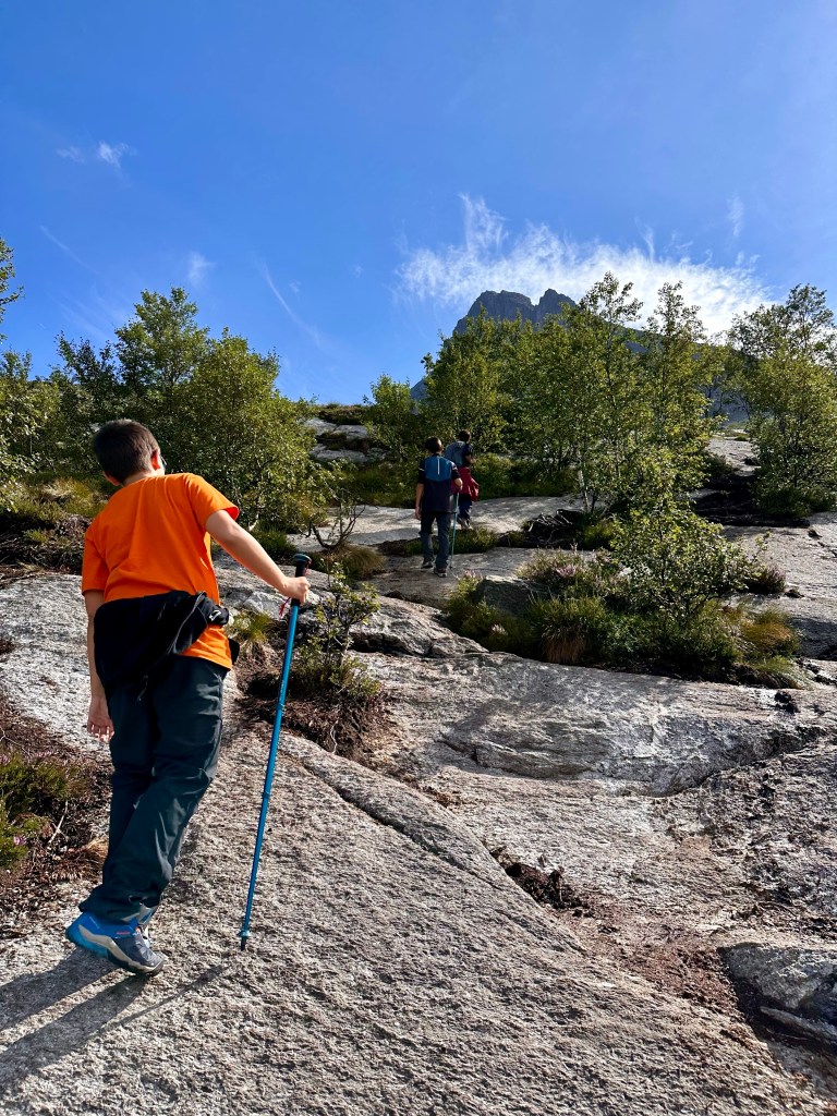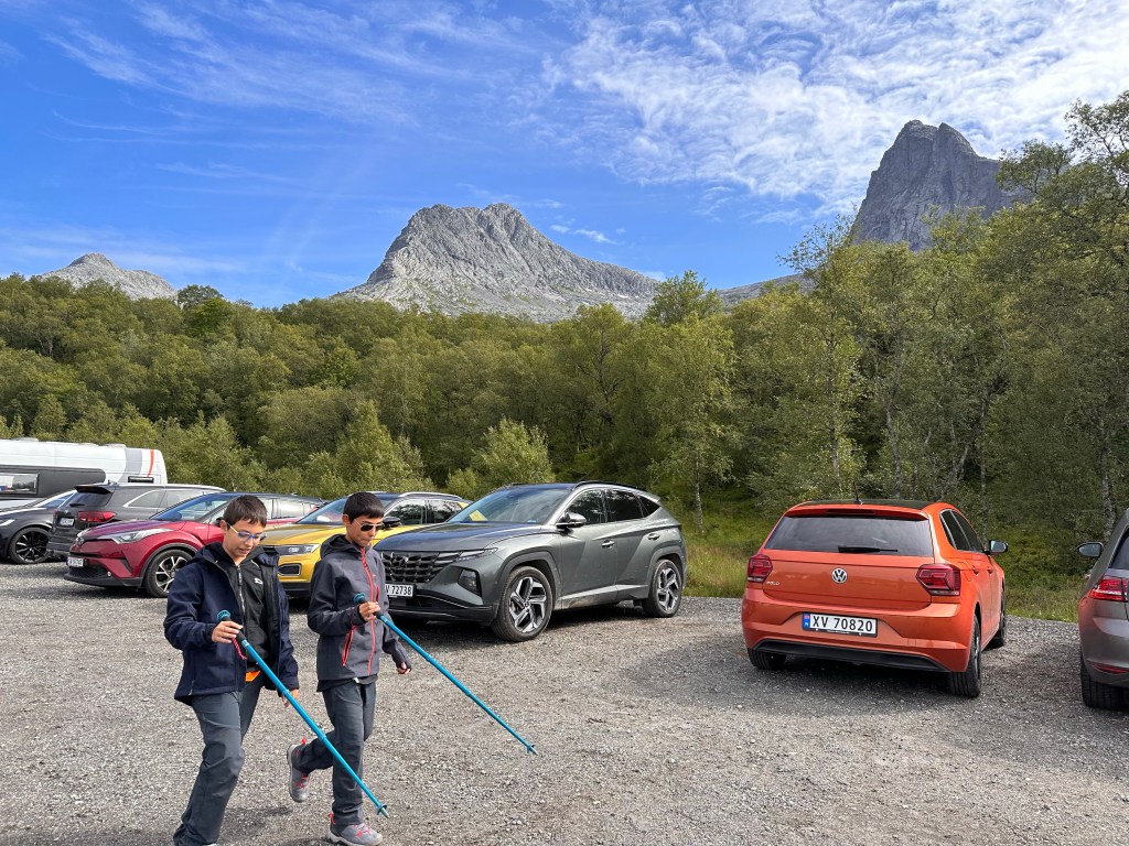 Parcheggiamo, ci equipaggiamo di tutto punto e alle 13:40 partiamo. Il cartello però non è dei più incoraggianti, infatti preannuncia un dislivello di 1000m per raggiungere il punto più alto ed una difficoltà nella scala di colori (verde, blu, rosso, nero) pari a… nero. D’altro canto il sito visitnorway diceva che è un percorso fattibile per famiglie… così partiamo per sgranchirci le gambe ed approfittare della giornata che si è fatta decisamente soleggiata.