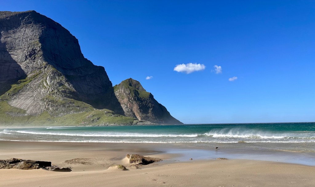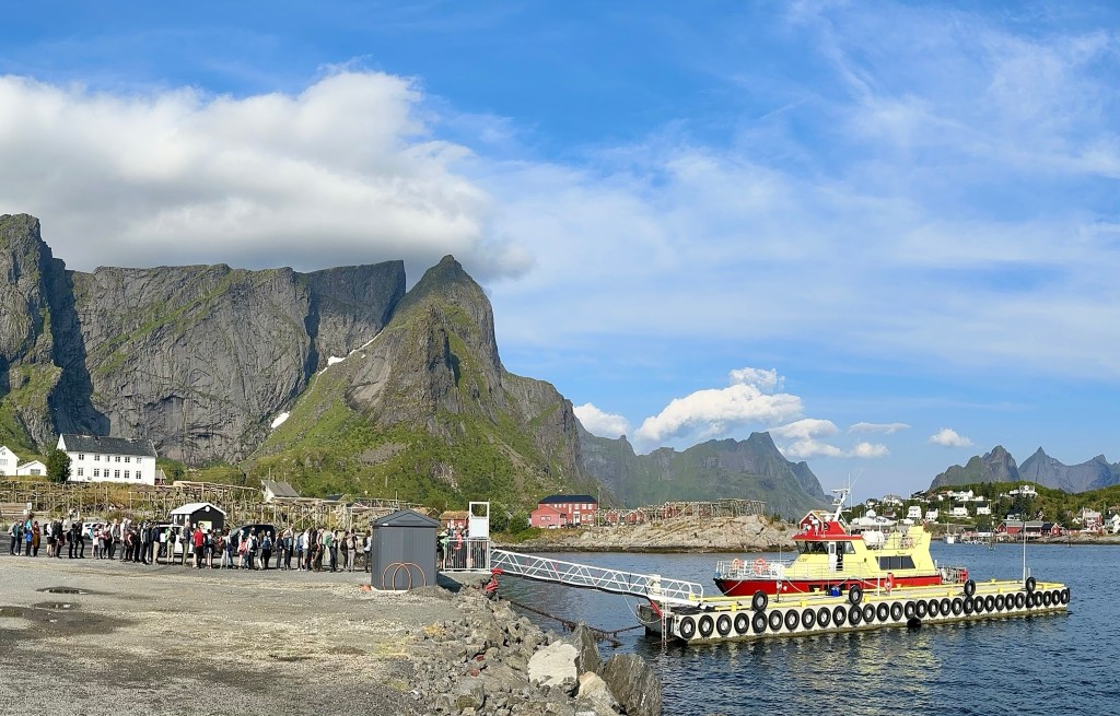 Si tratta di un’altra meta super consigliata dai vari siti e report di viaggio: un’immensa spiaggia di sabbia bianca, con acqua azzurrissima. Dunque ci mettiamo in fila di buon ora al molo, perché non è possibile acquistare il biglietto online e speriamo di riuscire a prendere il viaggio delle 9:30 visto che il successivo sarà solamente alle 15. Chi non ci sta sulla barca (una piccola motonave)“si attacca al tram”. In totale ci sono 3 corse andata e 3 corse ritorno al giorno. Questo è lo spirito Norvegese, rispetto alle loro stupende attrazioni turistiche. Una sola compagnia, 3 corse al giorno, anche ad Agosto e nessun prezzo esposto.
