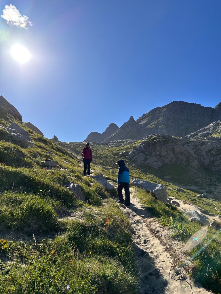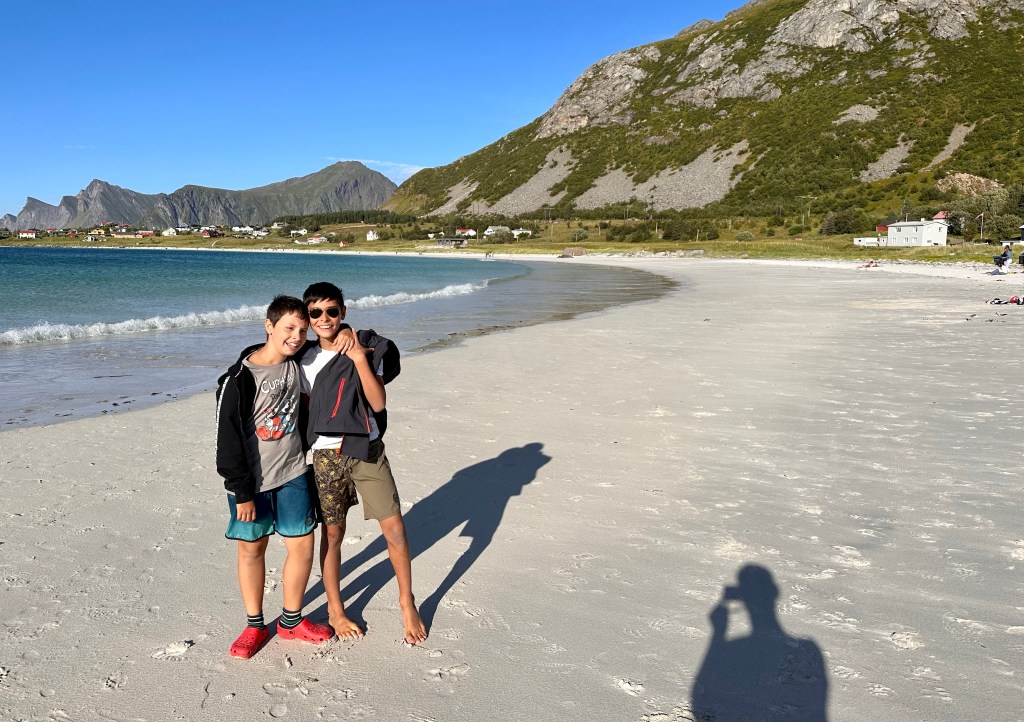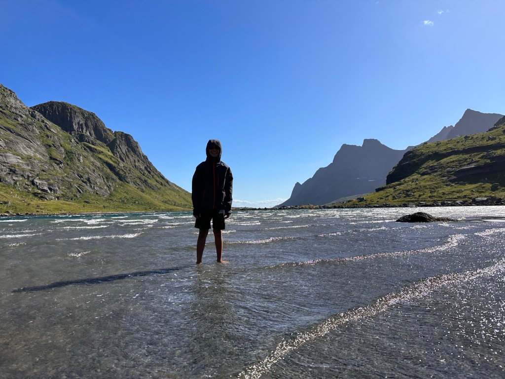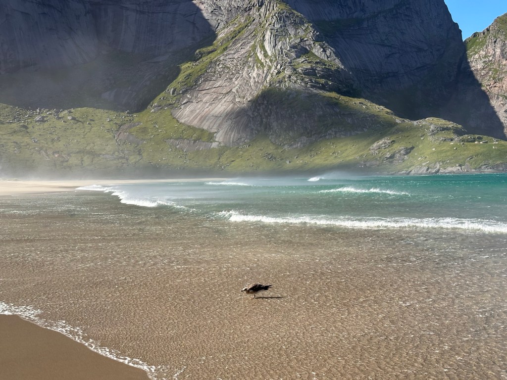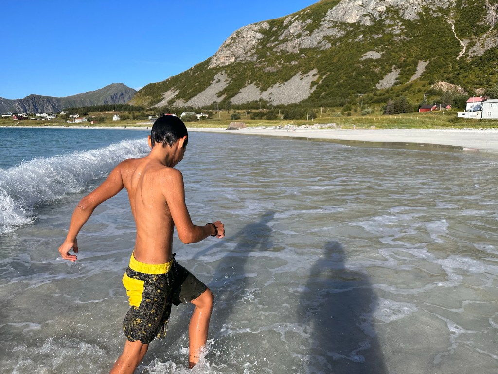 Perciò quando passiamo da Ramberg e la sua bellissima, lunghissima spiaggiona bianca con acqua turchese ci fermiamo. Indossiamo costumi e crocs e nonostante siano ormai le 18 scendiamo al mare. Io e Giovanni siamo gli unici a fare il bagno, oltre ad una bimba chiaramente nordica e con una specie di muta.