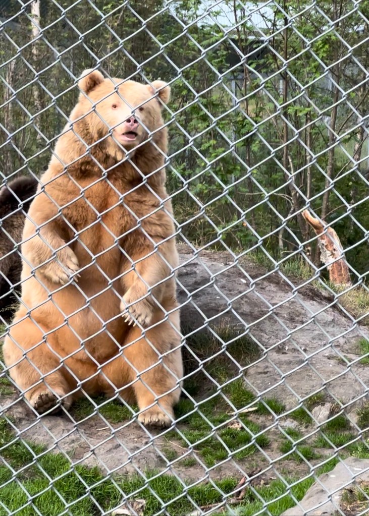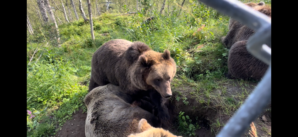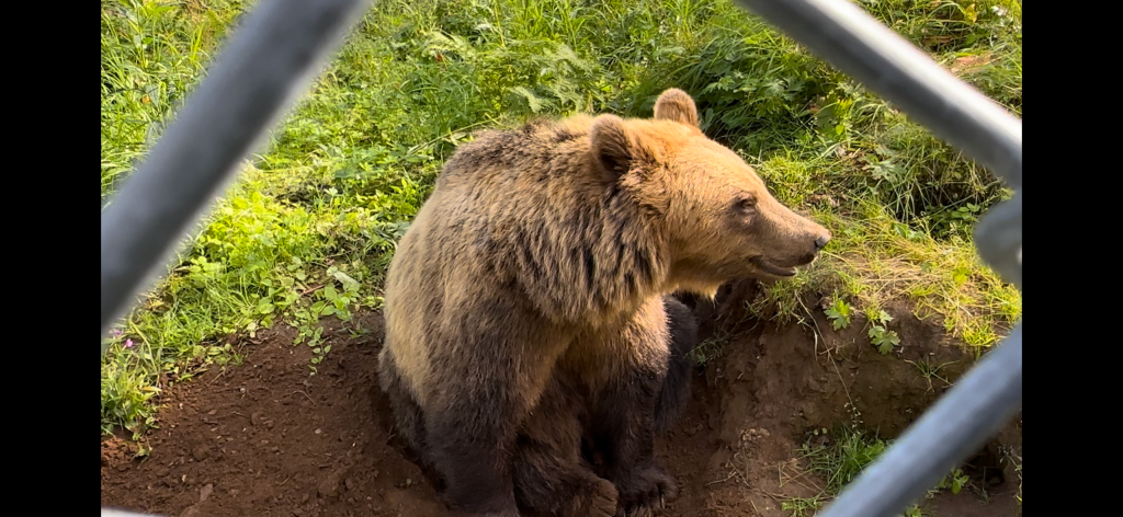 Poi facciamo un giro intorno all’enorme recinto degli orsi, un intera porzione di bosco con ruscello e valli. E ci esaltiamo quando riusciamo a vederne uno, muoversi tra i cespugli e mangiare erbe e foglie, con la sua buffa andatura e la sua mole maestosa, poi ne arriva un altro e un altro ancora. Restiamo lì per un bel po’ ad osservare questa famiglia di cui riusciamo a contare sei esemplari di varie dimensioni e diverse sfumature di colore.
